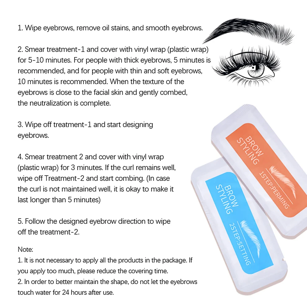 Для проектирования бровей, она может длиться 45-60 дней. Пожалуйста, обратитесь к видео для действия.1. Протрите брови, удалите масляные пятна и гладкие брови.2. Смазка-1 и крышка с виниловой пленкой (пластиковой пленкой) в течение 5-10 минут. Для людей с густыми бровями рекомендуется 5 минут, а для людей с тонкими и мягкими бровями рекомендуется 10 минут. Когда текстура бровей близка к коже лица и мягко чесывается, нейтрализация завершена.3. Протрите лечение-1 и начните проектировать брови.4. Смазка 2 и крышка с виниловой пленкой (пластиковой пленкой) в течение 3 минут. Если завиток остается хорошим, вытрите обработку-2 и начните расчесывать. (В чехол завиток не поддерживается хорошо, это нормально, чтобы сделать его дольше 5 минут)5. Следуйте разработанному направлению бровей, чтобы вытереть лечение-2.Примечание:1. Нет необходимости применять все продукты в посылка, если вы применяете слишком много, пожалуйста, уменьшите время покрытия.2. Чтобы лучше сохранить форму, не дайте бровям прикоснуться к воде в течение 24 часов после использования.