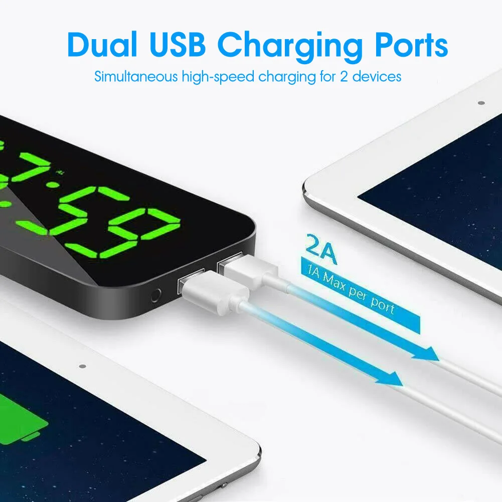 * Оснащен двумя usb-портами для зарядки на цифровом будильнике, вы можете заряжать два устройства одновременно с общим выходом 2,1 А. Не нужно беспокоиться о низком заряде батареи, когда вы играете в телефон на кровати.