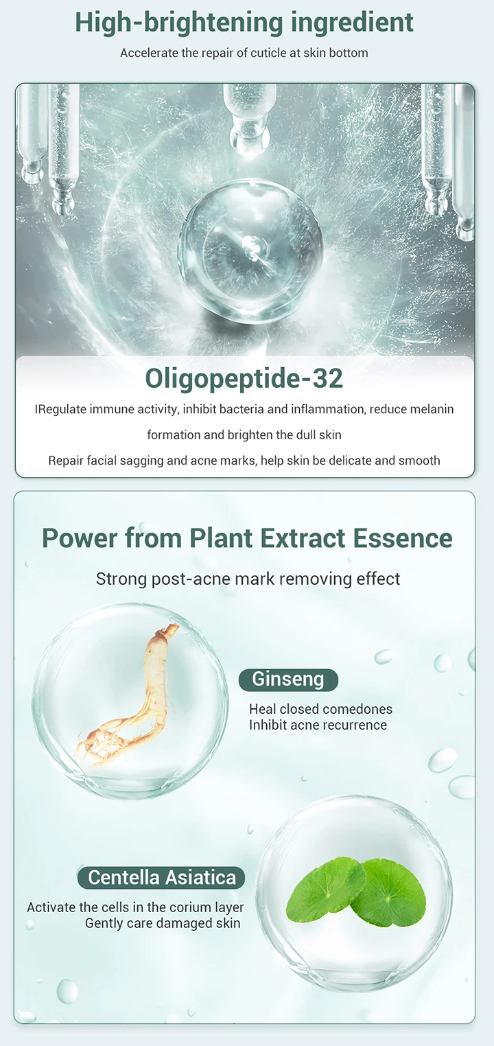 Oligopeptide-32Ускорьте ремонт кутикулы в нижней части кожиРегулируйте иммунную активность, подавляйте бактерии и воспаление, уменьшайте образование меланина и осветляйте тусклую кожуВосстанавливает провисание лица и акне, помогает коже быть нежной и гладкойМощность от экстракта растений эссенцияСильный эффект удаления после акнеЖеньшеньЛечение замкнутых комедоновИнгибирует рецидив акнеCentella AsiaticaАктивируйте клетки в слое КорияБережно ухаживает за поврежденной кожей
