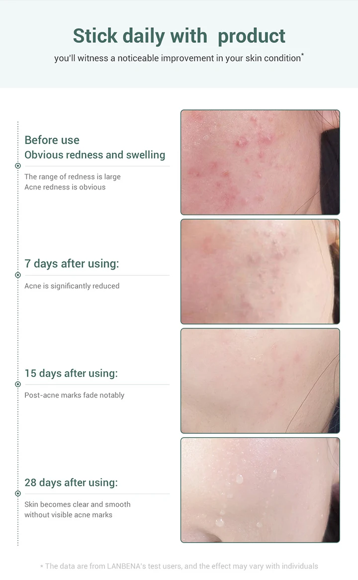 Вы увидите заметное улучшение состояния вашей кожи *Перед использованиемОчевидное покраснение и отекДиапазон покраснения-большая покраснение от акне7 дней после использования:Акне значительно снижается15 дней после использования:После акне следы выцветают особенно28 дней после использования:Кожа становится чистой и гладкой без видимых следов от акне* Данные от пользователей LANBENA, и эффект может варьироваться в зависимости от людей