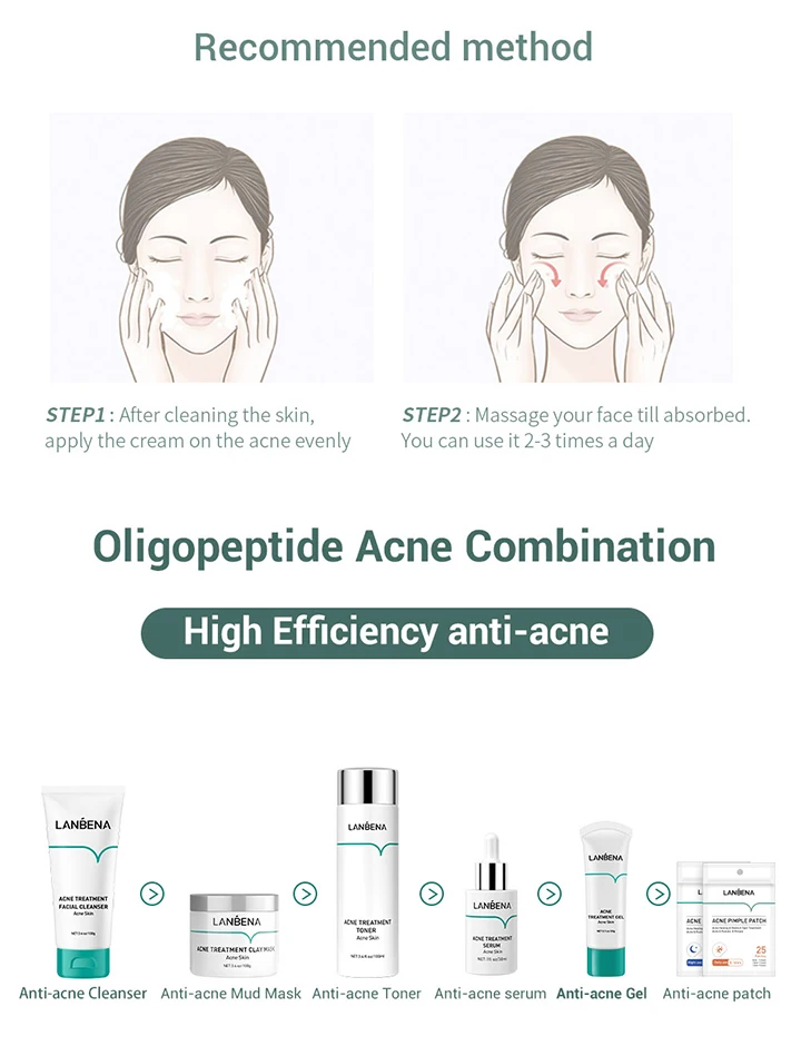 Шаг 1: после очистки кожи равномерно нанесите крем на акнеШаг 2: массируйте лицо до впитывания. Вы можете использовать его 2-3 раза в деньСочетание олигопептидных прыщейВысокая эффективность анти-акнеАнти-акне моющее средство анти-грязь от акне маска анти-акне тонерСыворотка против акне геланти-Патчи от акне