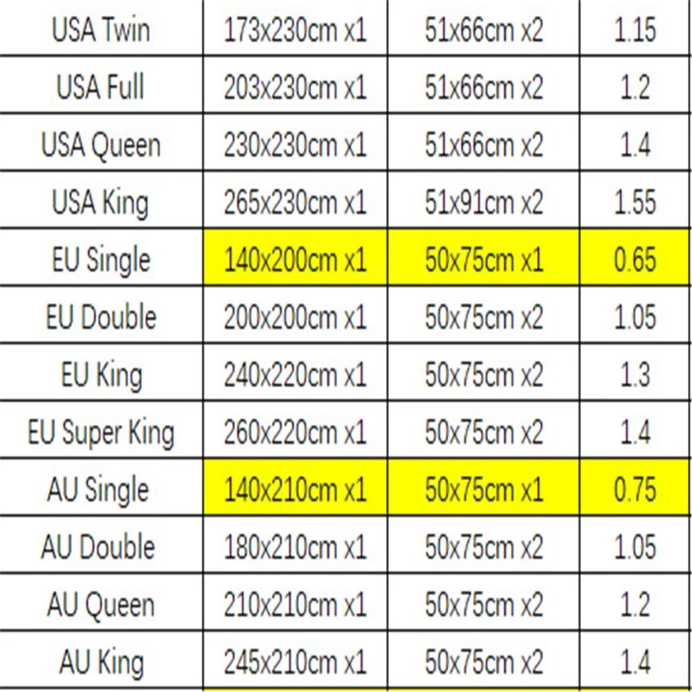 1. Aliexpress Размер постельного белья не является стандартным.Пожалуйста, выберите размер постельного белья в соответствии с вашим размером одеяла.2. Размер пододеяльника должен быть одинаковым с вашим одеялом, например,Если ваше одеяло 200x230 см, вы должны выбрать пододеяльник 200x230 см,Поэтому вы должны выбрать подходящий размер королевы или другие соответствующие размеры.3. Размеры в разных странах отличаются, поэтому мы указываем размеры в сантиметрах или дюймах.