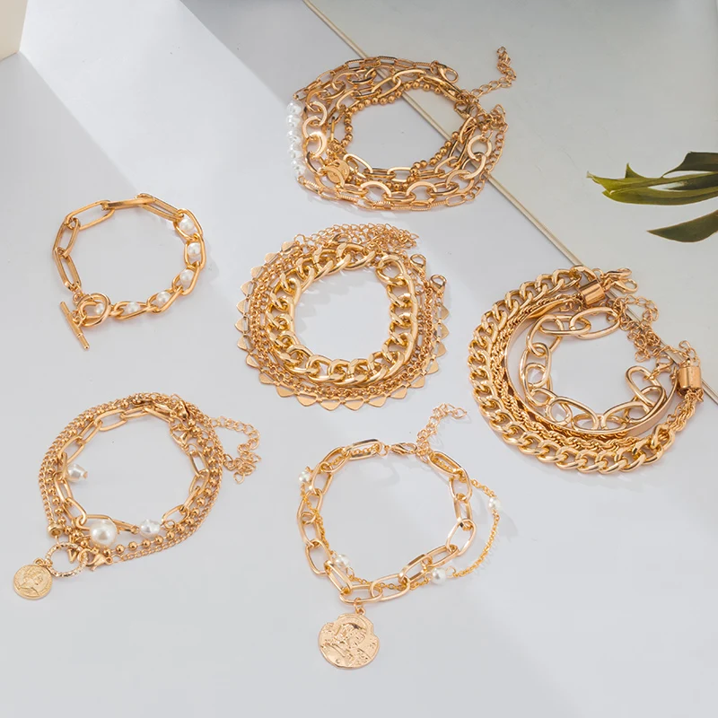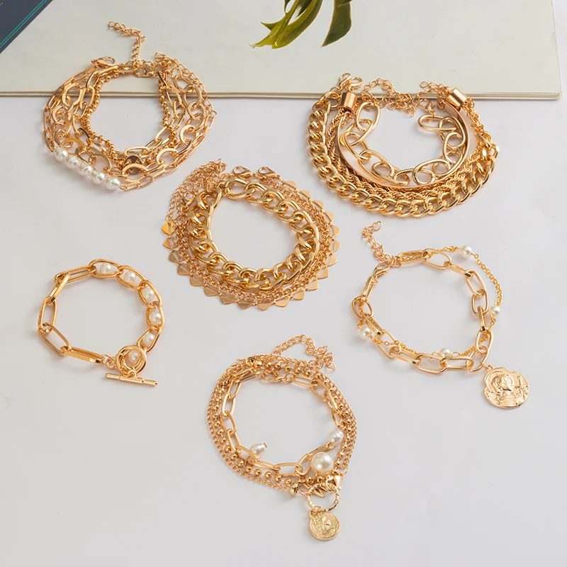 Женские многослойные браслеты в стиле панк, золотистые браслеты-цепочки в стиле ретро, кулон с портретом, жемчужные браслеты с подвесками, трендовые украшения, новинка 2021