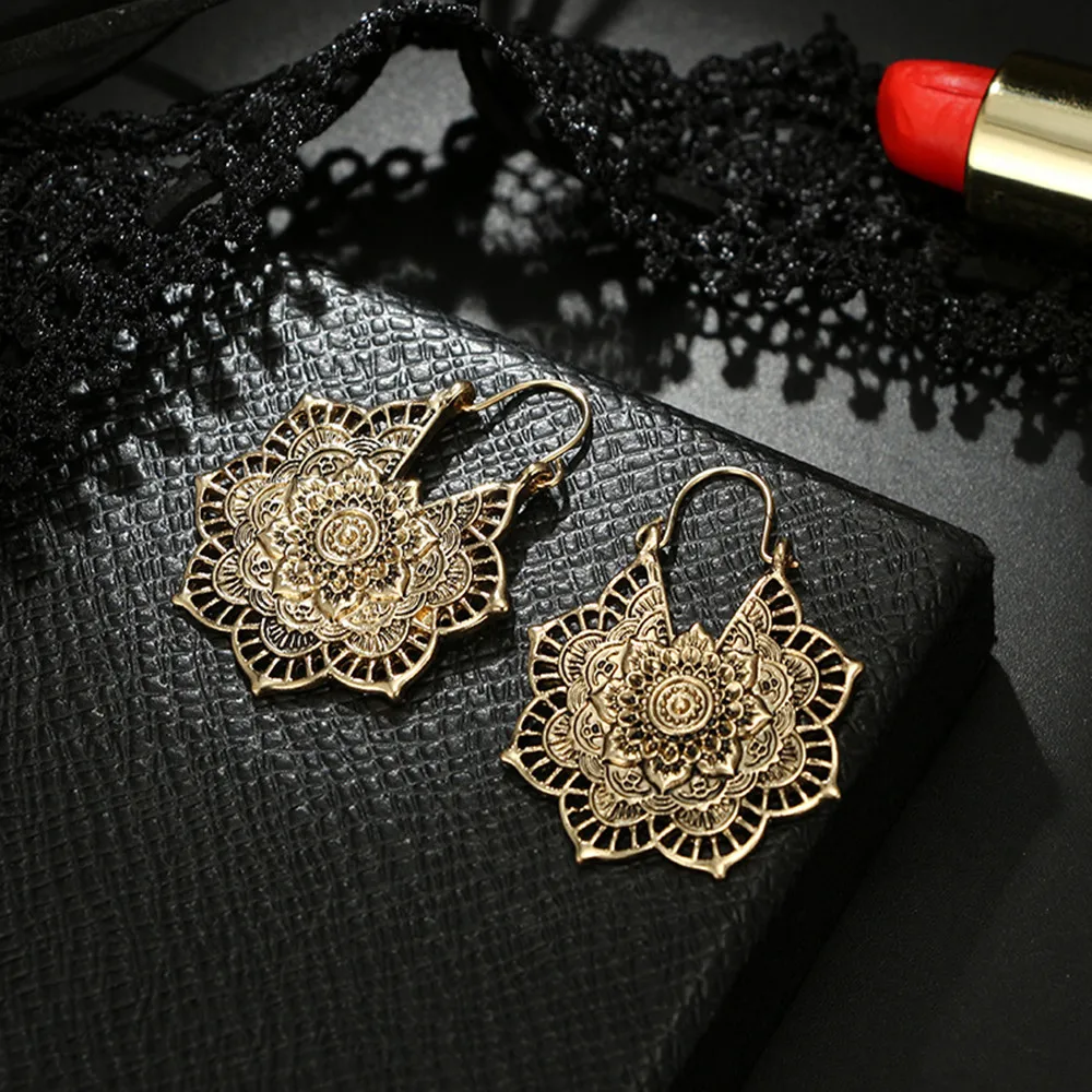 Античное серебро Цыганский индийский этнический обручВисячие серьги с мандалой в стиле бохо