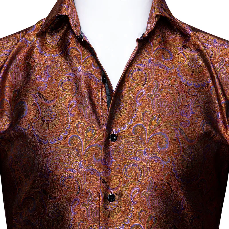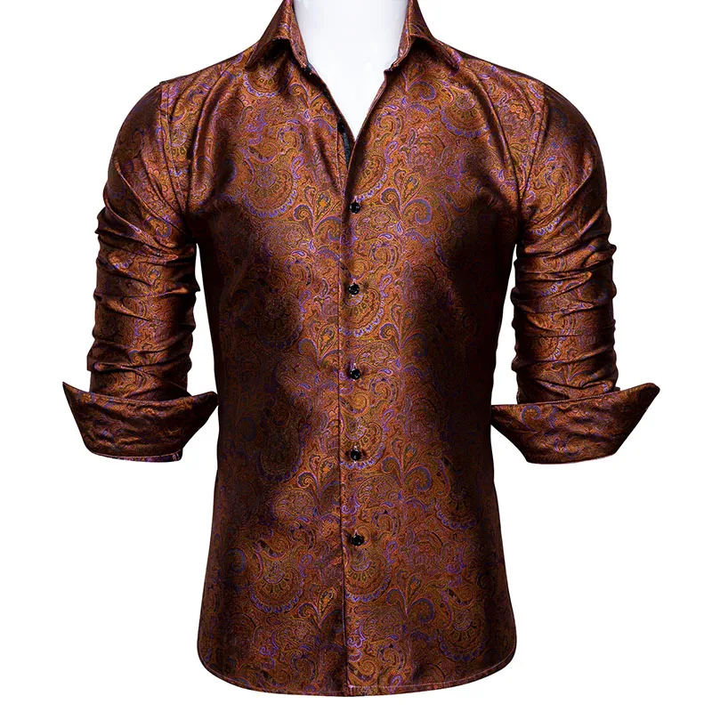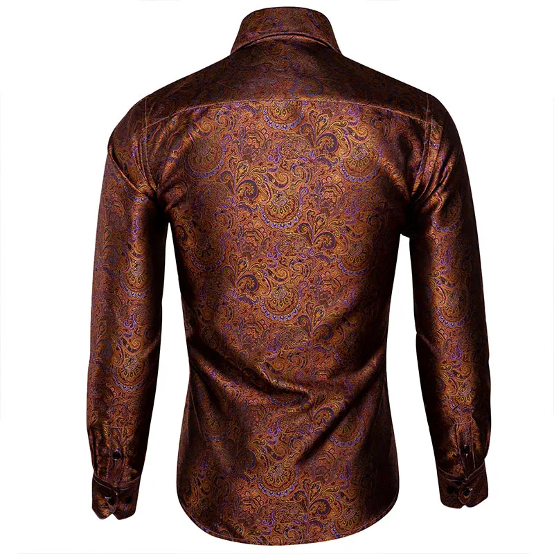 Barry.Wang Роскошные оранжевые шелковые рубашки с пейсли, мужские повседневные рубашки с длинным рукавом и золотыми цветами для мужчин, дизайнерские рубашки BCY-0030