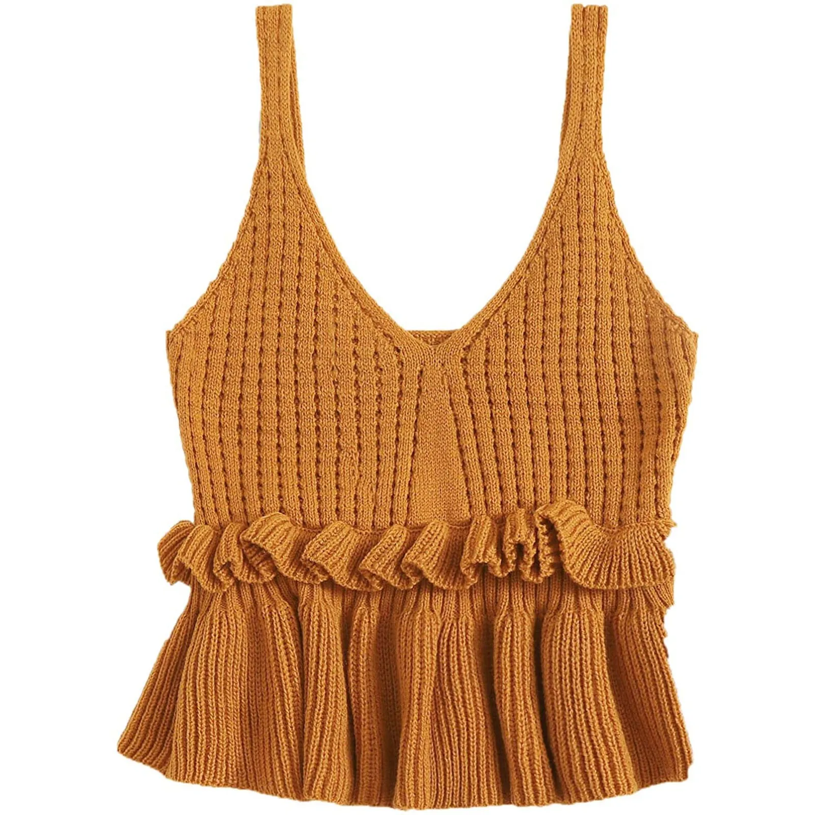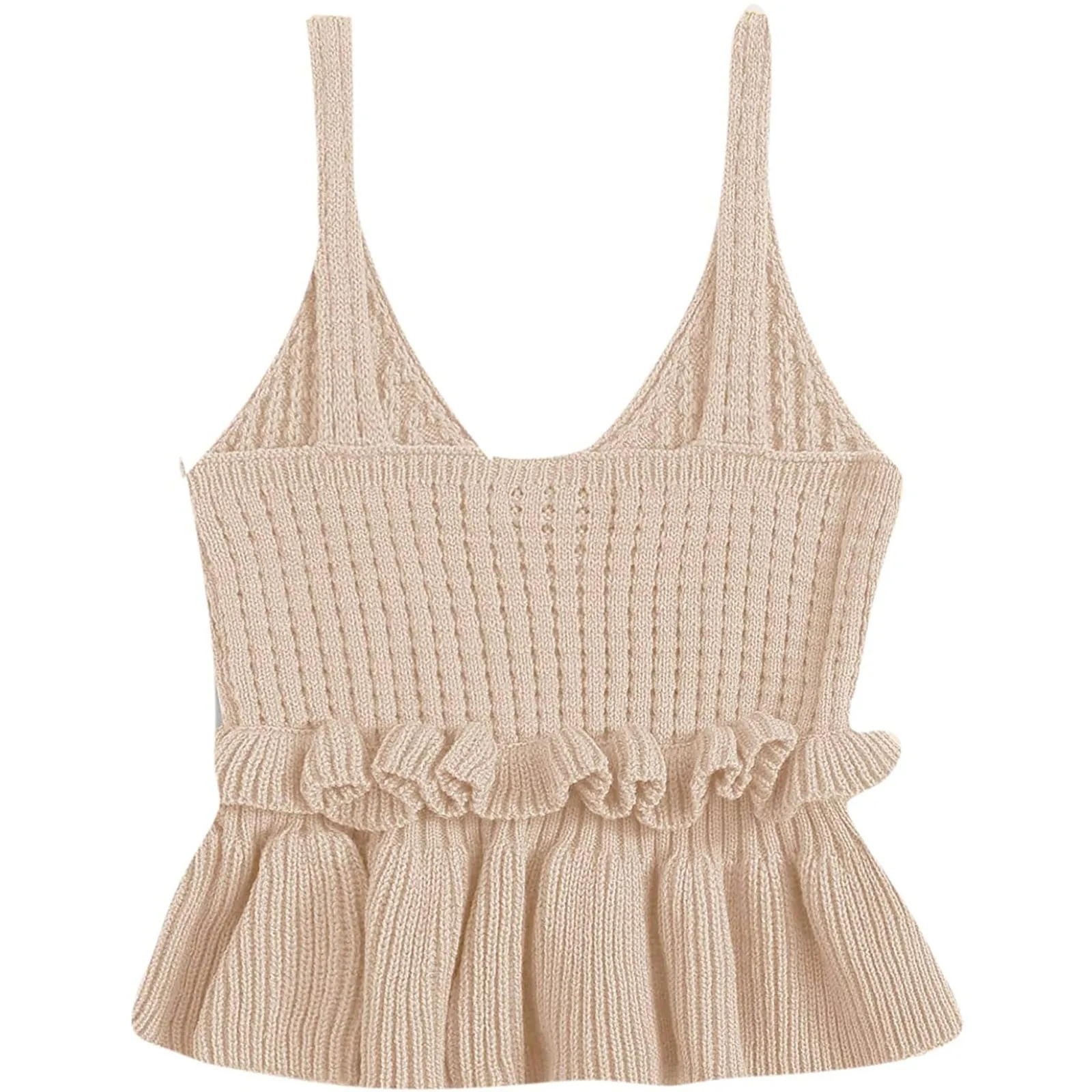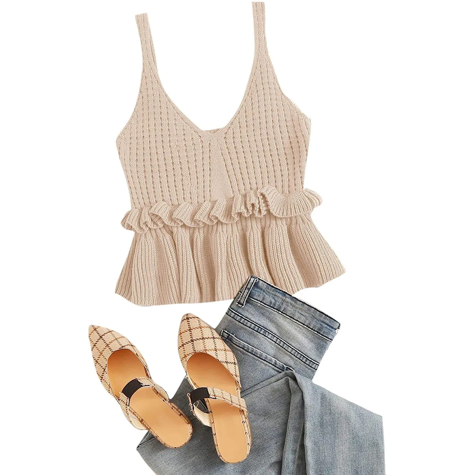 Женский укороченный топ 2021, повседневный вязаный топ без рукавов, с оборками на Подоле и V-образным вырезом, укороченный топ с баской, однотонный Свободный топ, женский топ