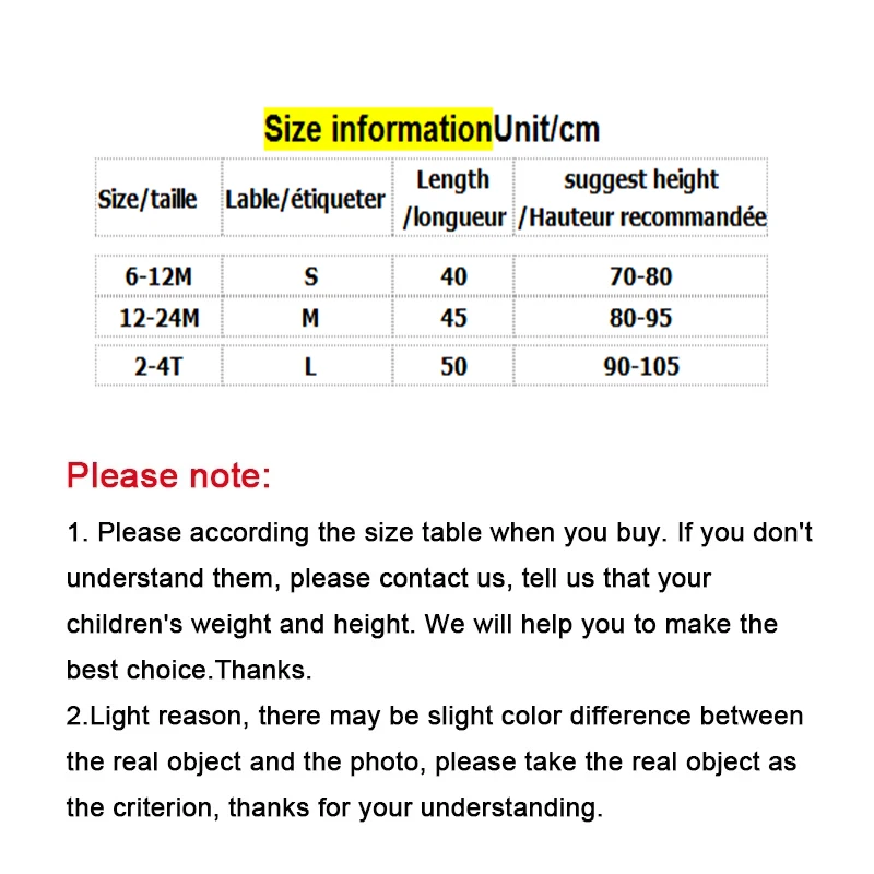 1. Пожалуйста, при покупке выбирайте размер в соответствии с таблицей размеров. Если вы не понимаете их, пожалуйста, свяжитесь с нами, сообщите нам вес и рост вашего ребенка. Мы поможем вам сделать лучший выбор. Спасибо.