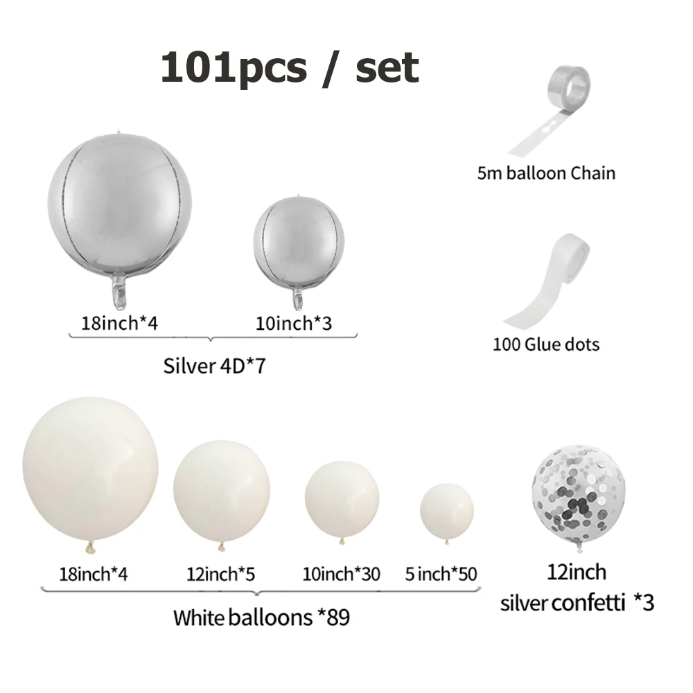 4 шт. maca воздушный шар 18 дюймов белый5 шт. воздушный шар мака 12 дюймов белый30 шт Maca воздушный шар 10 дюймов белый50 шт maca воздушный шар 5 дюймов белый3pc4D шар 10 дюймов Серебряный4pc4D шар 18 дюймов серебро3 шт расшитый блестками шар 12 дюймов Серебряный1 шт. двойная кольцевая воздушная цепь1 шт. воздушный шар
