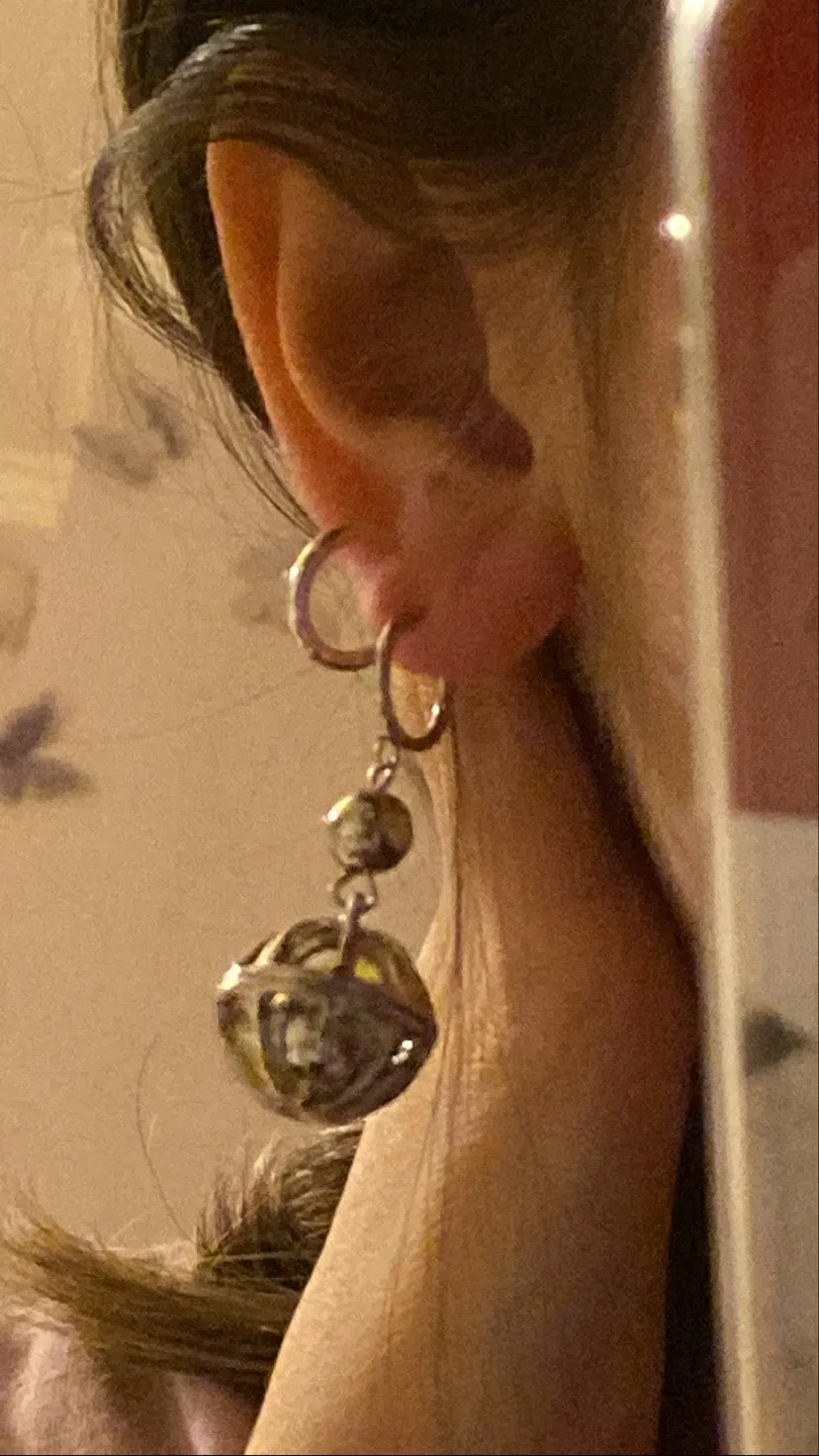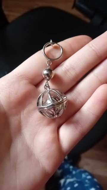 Тяжёленькая, но красивая. Колечко - это клипс, он плотный, сережка не упадёт и ухо не передавит. Боялась, что бубенчик будет звонким, но звук негромкий.