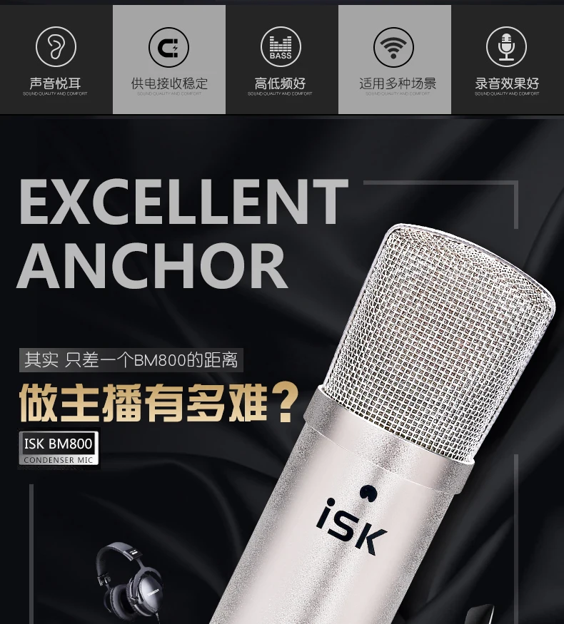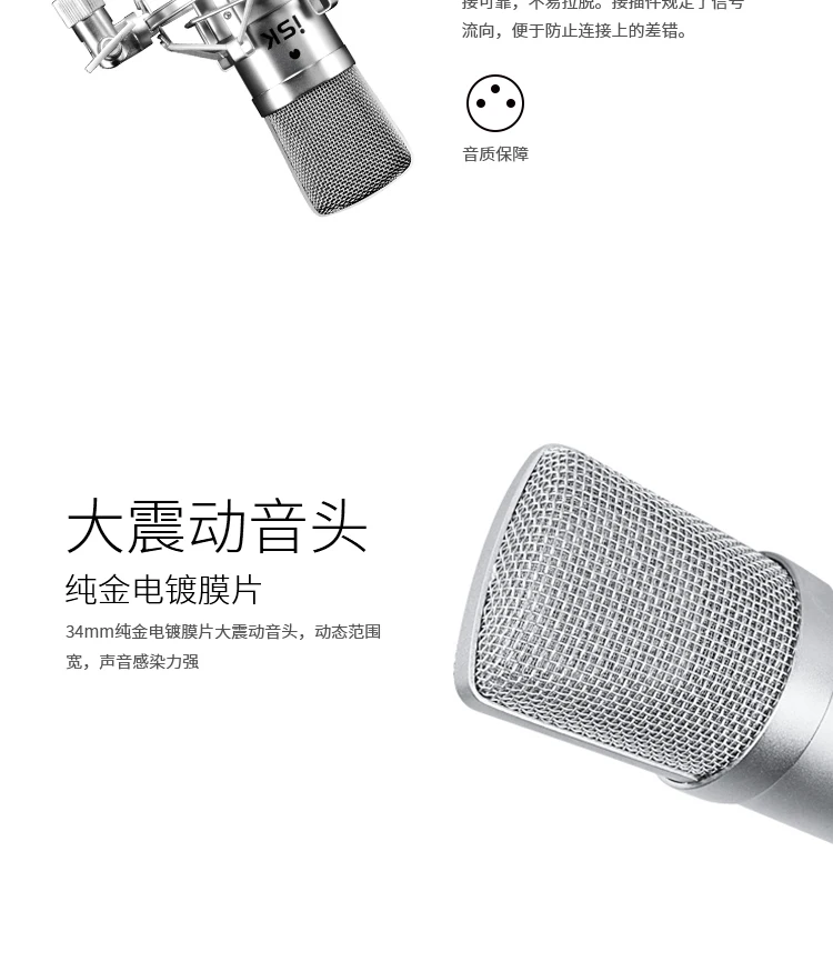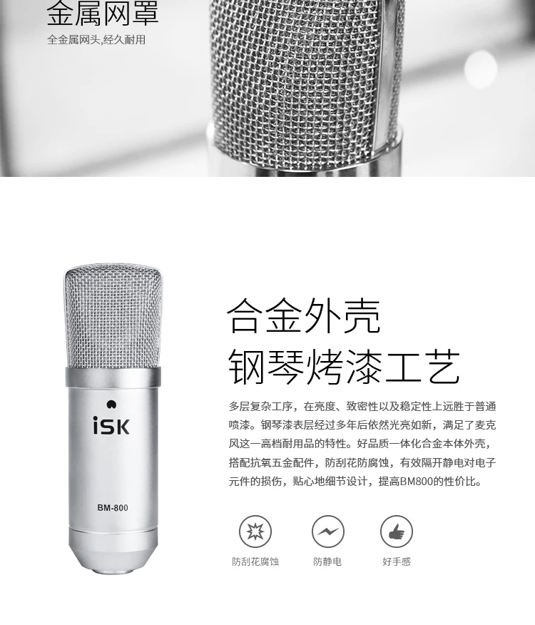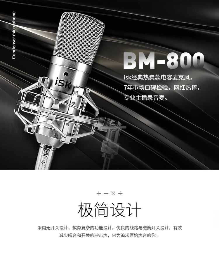 ISK BM-800-это профессиональный конденсаторный микрофон, который использует Позолоченную мембранную капсулу диаметром 34 мм.