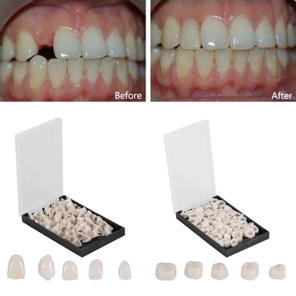 2 коробки Ложные зубные короны из смолы фарфоровый материал Временная зубная Корона реалистичный уход за полостью рта Отбеливание зубов Передняя молярная Корона (100 шт)