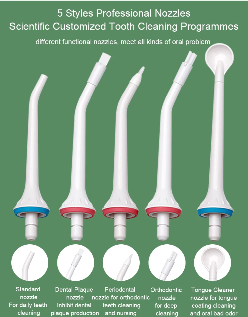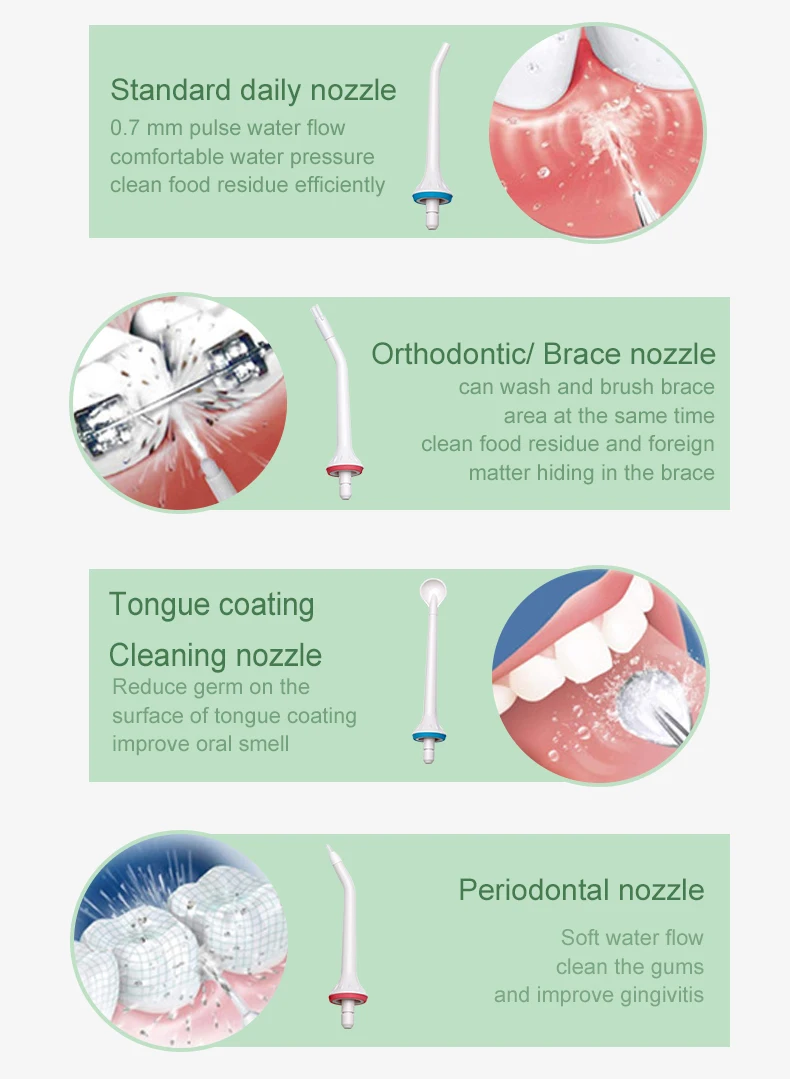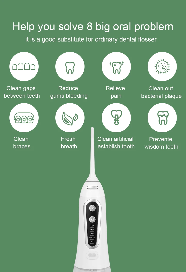 1. Наш беспроводной ирригатор полости рта использует Высокочастотный импульсный поток воды и 360 градусов вращающееся сопло для очистки зубов во всех направлениях и эффективного удаления остатков между зубами, С целью сделать ваши зубы белыми и безупречными.2. Наши продукты обеспечивают 5 режимов переменной частоты очистки, 5 регулируемого давления воды и 6 насадок для удовлетворения ваших личных потребностей и улучшения состояния полости рта.3. Эта Стоматологическая флушер помогает удалить пятна зубного камня, освежить дыхание, уменьшить отеки десен и боль, улучшить кровотечение десен, предотвратить кариес зубов, подсчета и болезни десен.