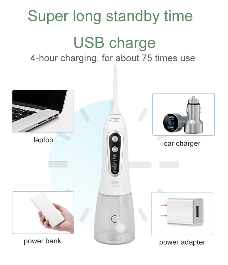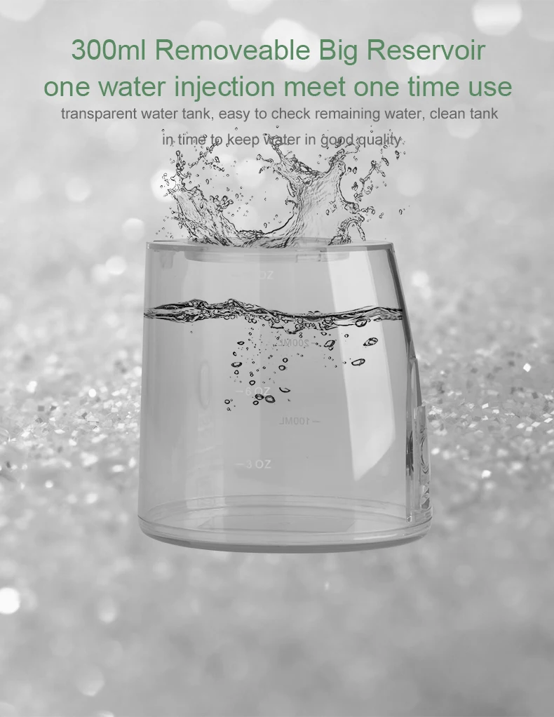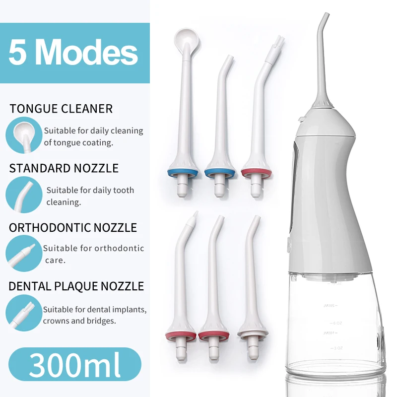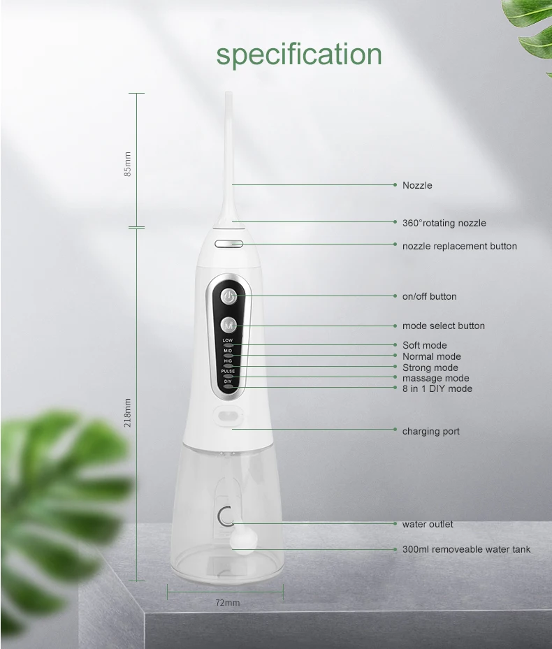 4. Зубочистка оснащена съемным прозрачным резервуаром для воды с большой емкостью 300 мл, который не требует повторного пополнения и, конечно, легко чистится.5. Наша стоматологическая флушер является водонепроницаемым IPX8 и может смывать всю машину, не беспокоясь о повреждении, вызванном попаданием воды.6. Обтекаемый корпус С нескользящими частицами имеет эргономичный дизайн, удобен для захвата и не легко скользит из рук.7. Легкий и портативный корпус, быстрая зарядка через USB и долгий срок службы батареи делают его удобным для чистки полости рта в любое время и в любом месте. (Его можно использовать около 75 раз с одной зарядкой.)