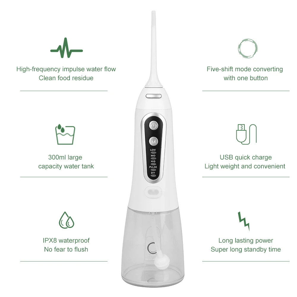 5 режимов зубная струя воды ирригатор полости рта для чистки зубов Вода Flosser отбеливание зубов выбор воды 350 мл рот стиральная машина стоматологическаяНазвание продукта: ирригатор полости ртаМатериал корпуса: 100% высококачественный АБС-пластикШум ирригатора полости рта: низкий уровень шумаВремя использования ирригатора полости рта: не менее 3 летЕмкость резервуара для воды: 300 мл резервуар для водыВходное напряжение адаптера питания: Совместимо с мировым напряжением (100-240 В)Тип батареи: перезаряжаемая литиевая батарея 1400 мАчРежим зарядки: удобная портативная зарядка через USBВремя зарядки: 4 часаВремя работы полностью заряжено: 45 дней (работает два раза каждый день)Размер водяного флоссера: L85 * W72 * 218 ммВес зубной нити: 0,33 кг