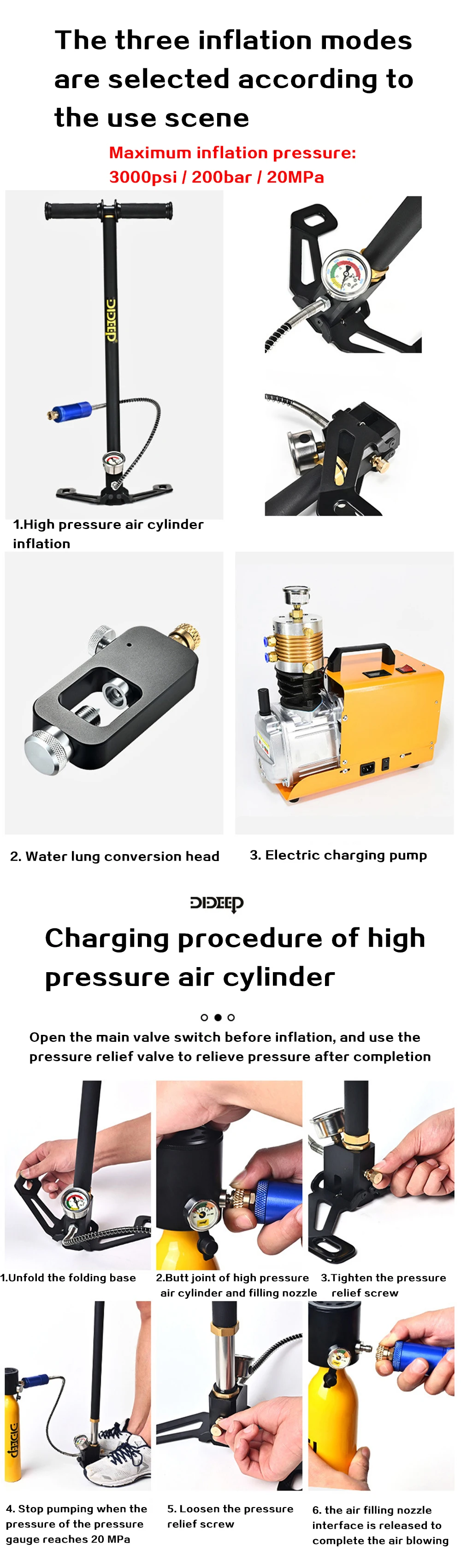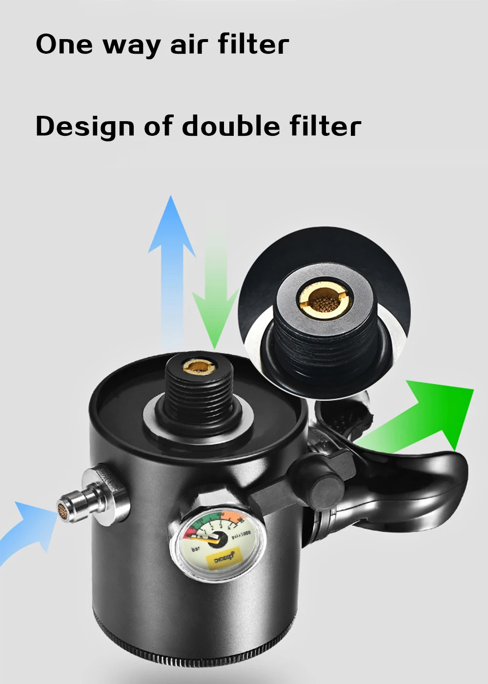 Особенности:1. Кислородный баллон 0,5л позволяет ныряльщику оставаться на 1-10 метров под водой в течение 5-12 минут (в зависимости от индивидуальной емкости легких и глубины погружения), идеально подходит для начинающих.2. Поддерживает 3 типа надувания: ручной надувной насос высокого давления, переключатель aqualung, электрический насос. (насос для надувания не входит в комплект)3. Использует алюминиевый материал 6061T6 и отвечает производственным стандартам для водолазного оборудования.4. Поставляется с манометром, чтобы показать, сколько воздуха находится в резервуаре для дайвинга.5. Оснащен эргономичным силиконовым мундштуком.6. Нажмите и удерживайте верхнюю часть, чтобы выпустить пресс внутри бутылки.7. Легкий и портативный дизайн, его можно взять на борту после скручивания дыхательного клапана.