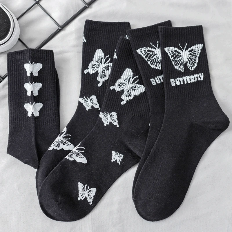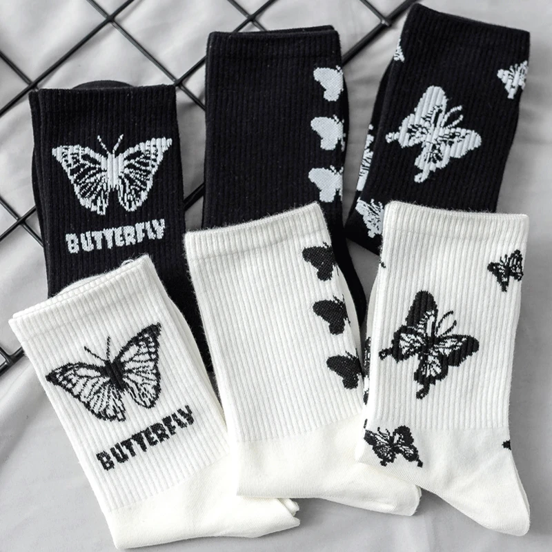 Носки женские с мультяшным принтом бабочки, уличная одежда в стиле Харадзюку, мягкие хлопковые дышащие эластичные, милые черные белые, на весну