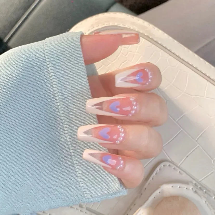 Искусственные ногти в виде белого сердца с дизайном градиентные стразы жемчужный гроб Искусственный Лук Длинные балерины искусственные ногти Z1348