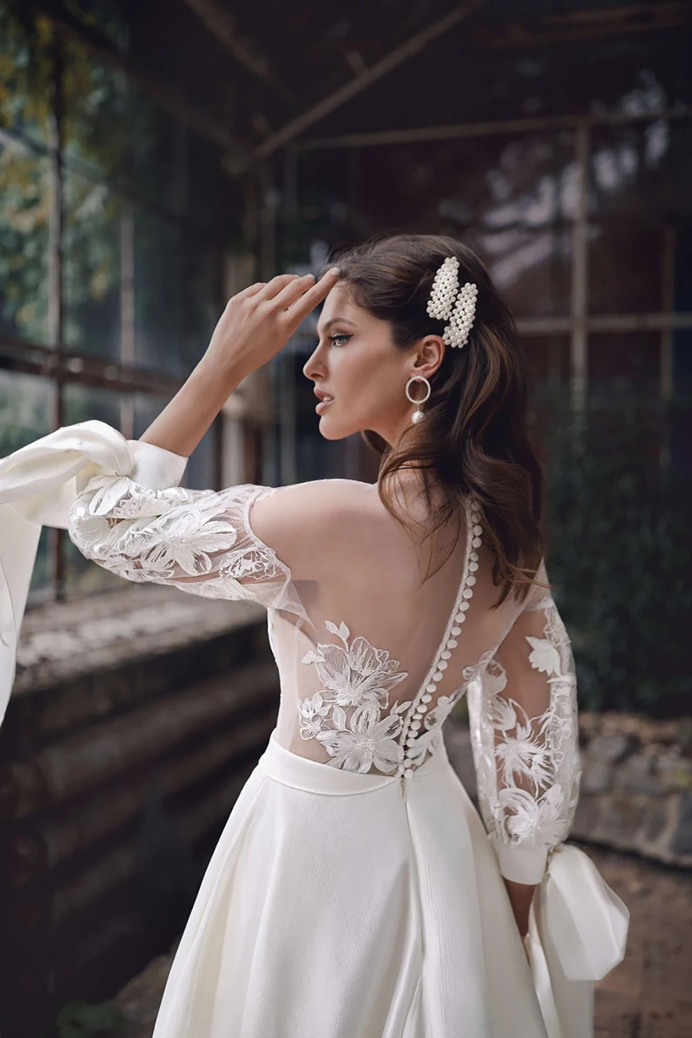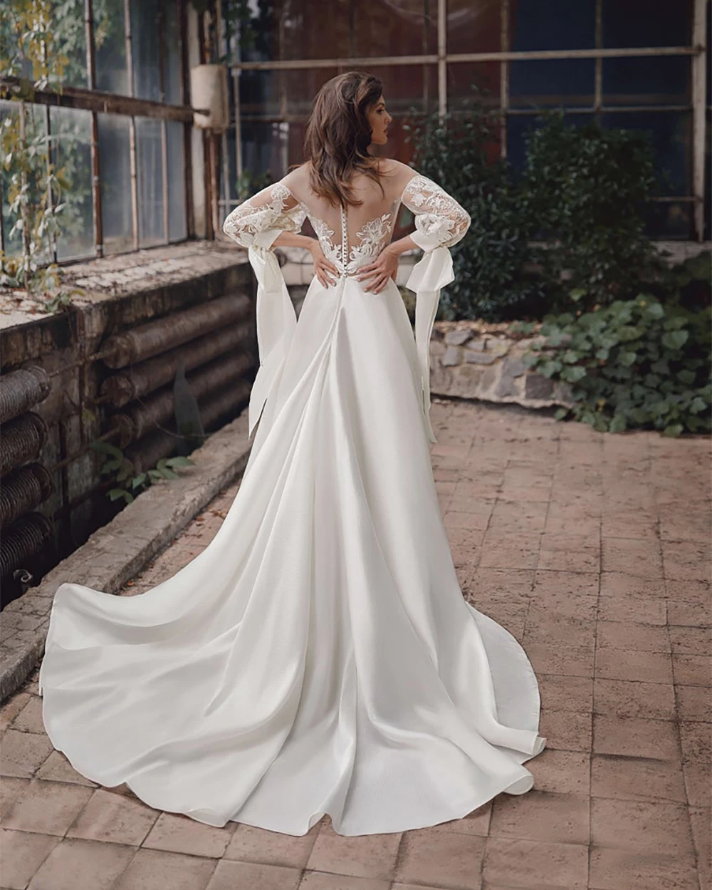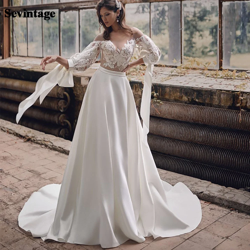 Винтажное атласное свадебное платье Se, с длинным рукавом, V-образным вырезом, Кружевная аппликация, с открытой спиной, ТРАПЕЦИЕВИДНОЕ свадебное платье с цветочной вышивкой