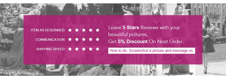 Мы очень рады работать для вас, и все наши усилия направлены на то, чтобы получить все больше и больше лучшего обслуживания для поддержки ваших потребностей в платьях или бизнесе. Поэтому ваши любезные и удовлетворенные комментарии очень важны для нас. И это определенно поможет нам обоим в будущем бизнес-сотрудничестве. И ваши быстрые положительные отзывы будут высоко оценены.Также, пожалуйста, свяжитесь с нами, если у вас есть какие-либо проблемы. Вы можете отправить электронное письмо или пообщаться с нами онлайн, на все письма ответили в течение 1 рабочего дня. Если вы не получили наш ответ, пожалуйста, повторно отправьте ваш адрес электронной почты, мы ответим вам как можно скорее. Большое спасибо за вашу поддержку!