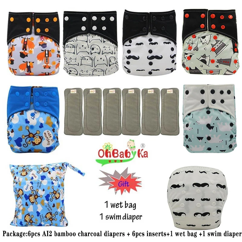 Посылка: 6 тканевых подгузников + 6 бамбуковый угольный вкладыш + 1 Бесплатный подгузник + 1 Бесплатный подгузник для плавания.