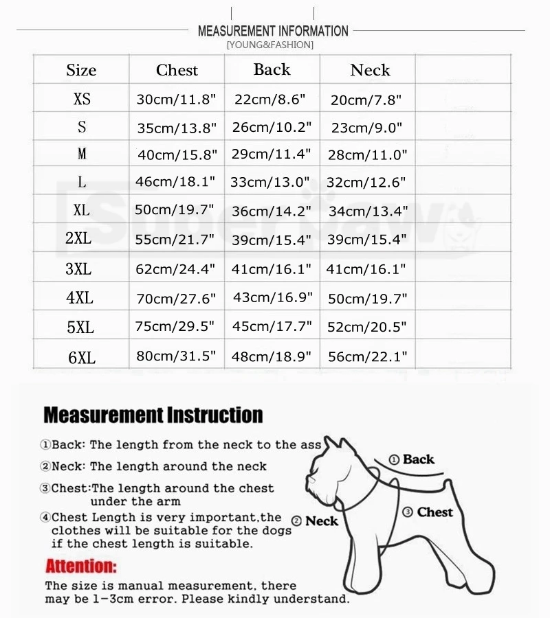 2. Для двух ног, пожалуйста, обратите внимание на обхват груди, и для четырех ног, должны соответствовать обхвату груди и длине спины.