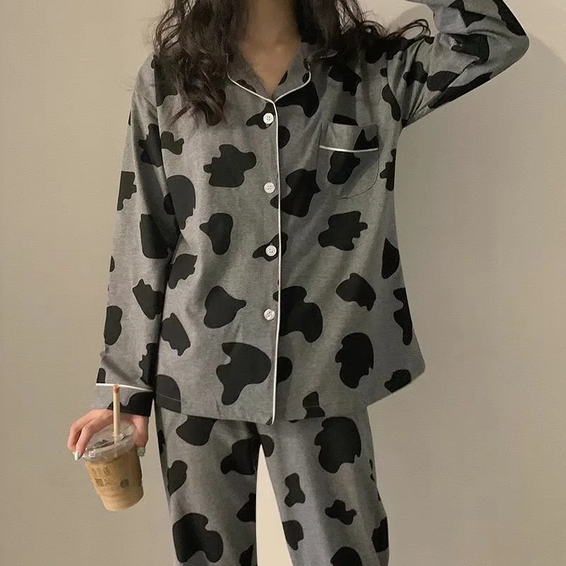 Женский пижамный комплект, весна-лето 2022, с отложным воротником и длинными рукавами + длинные брюки, домашний костюм из 2 предметов, одежда для сна, Пижама, одежда для отдыха