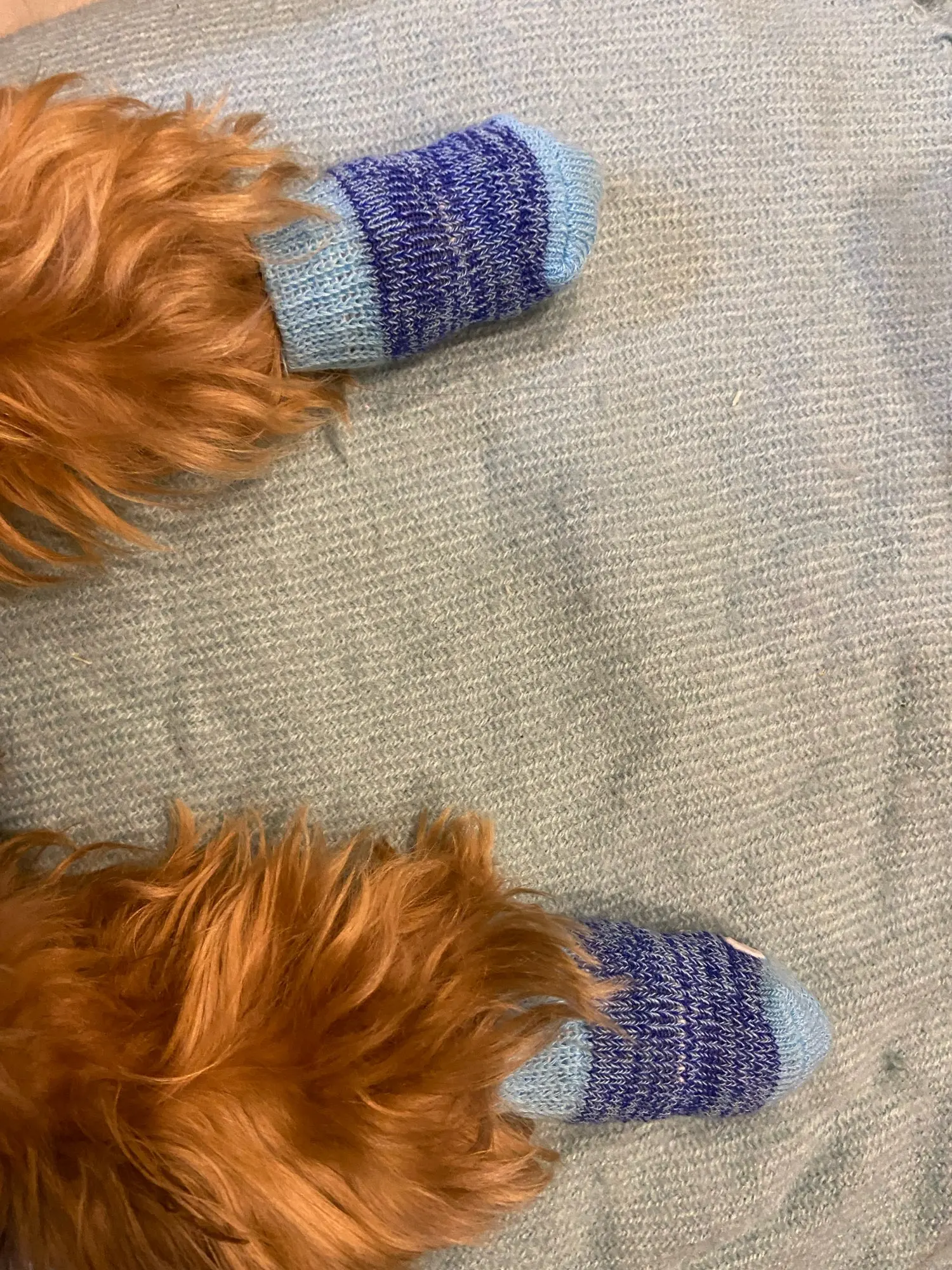 очень хорошие носочки, не спадают и собаке в них удобно бегать! на щенка чихуахуа полтора кг, самые маленькие носочки как влитые сидят