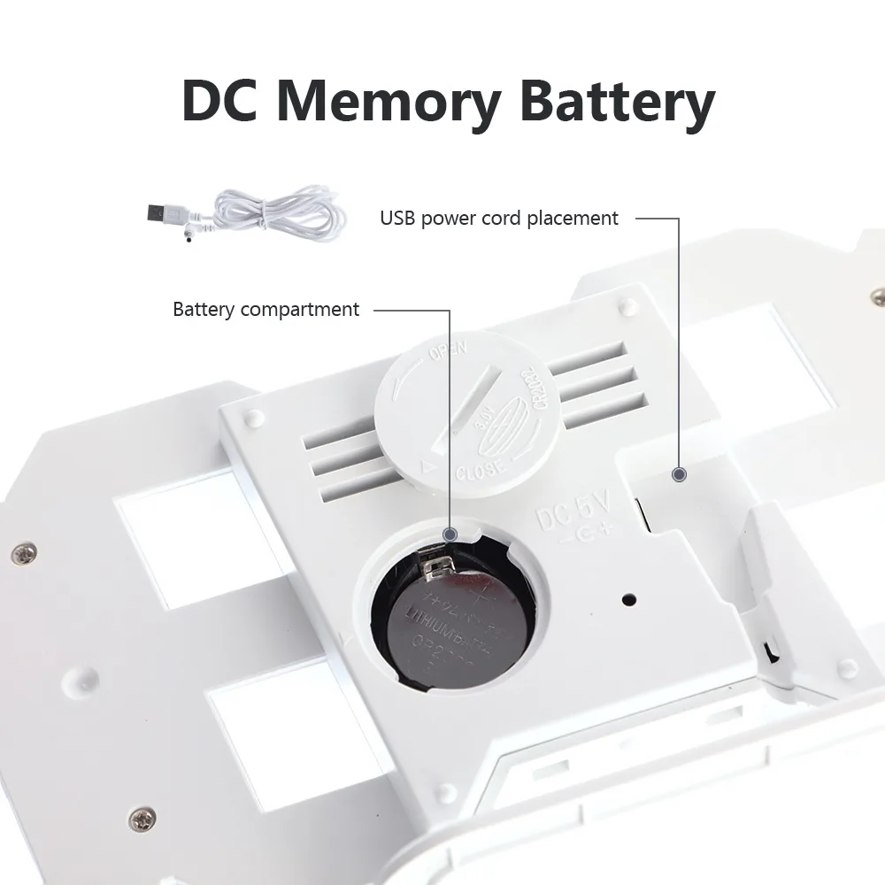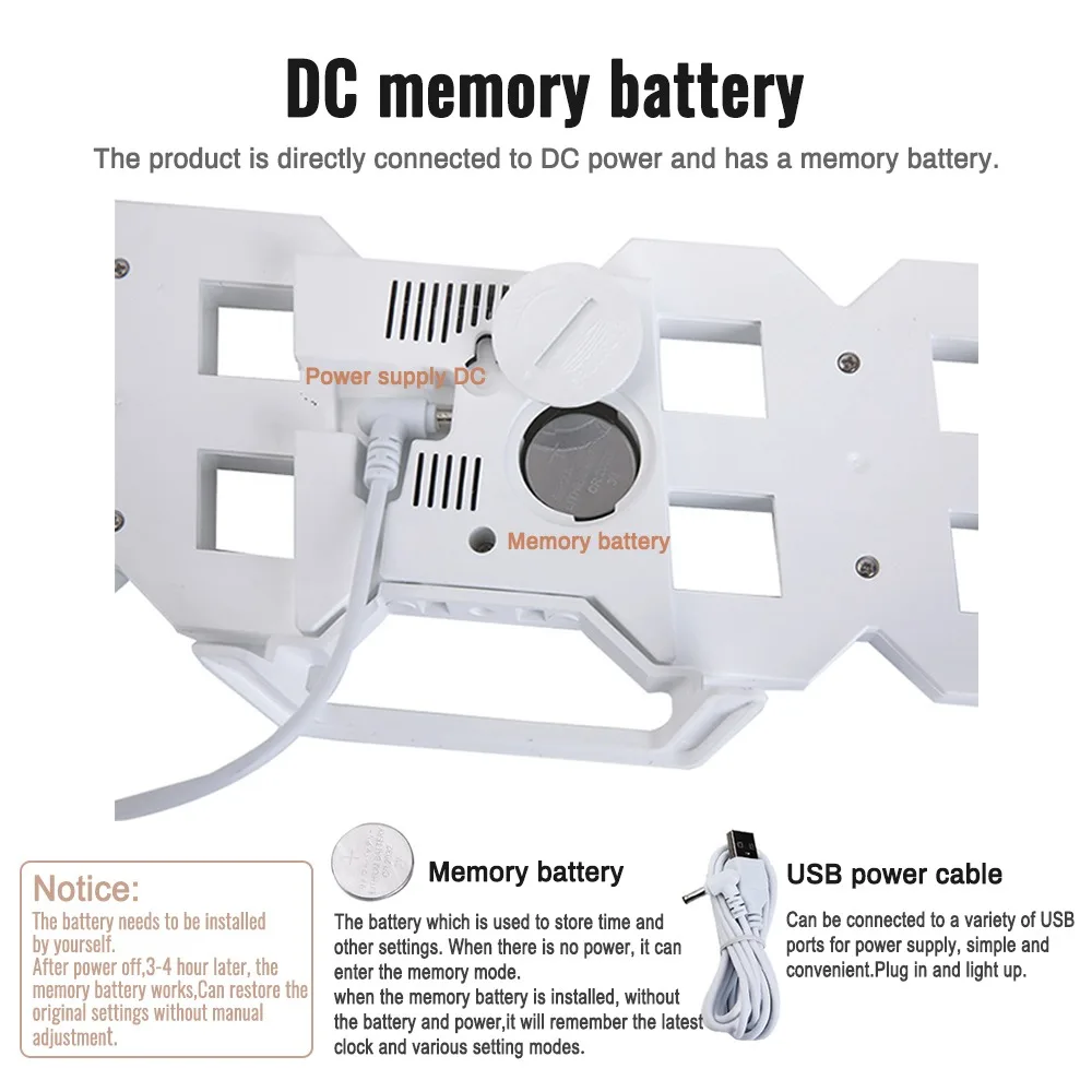 Спецификация:Материал: акрил + АБСАккумулятор: CR2032 (используется для хранения времени, когда мощность отключена (не входит в комплект), часы питаются от USB кабеля)Размер: 24*9*4 см (больше, чем в других магазинах)Мощность питания: DC 5V 0,75 WКомплексные настройки:1. Общие настройки:Нажмите кнопку «настройки», И набор "12 / 24 часа в сутки» → «Времени» → «год» → «Дата» → «℃/℉" через "+" и "-" кнопки. (Нажмите кнопку «Настройки», чтобы перейти к следующей настройке)2. Настройка режима яркости:Нажмите кнопку «+» button→ «L-SL» в спящем режиме с четырьмя уровнями автоматической чувствительности; «L-AU» с тремя уровнями автоматической чувствительности; «L-01» с первой яркостью; "L-02" вторая яркость; "L-" 03 "третья яркость; Выключите дисплей. Выполните цикл работы.3. Настройка режима отображения:Нажмите кнопку «+», чтобы переключить режим отображения:(1) только время отображения(2) Отображение времени, даты, температурного циклаНастройки сигнализации:1. Нажмите кнопку «-», чтобы включить/выключить будильник2. Нажмите кнопку "-", чтобы войти в режим сигнализации3. Вздремнуть:При звуке будильника нажмите любую клавишу, чтобы начать snoozing, и индикатор тревоги мигает медленно4. Выключите будильник:При звуке будильника нажмите любую клавишу, чтобы выключить будильник и войти в следующий режим будильникаПосылка включает в себя:1 x светодиодный часы (без розничной коробки)1 х USB кабель (2 м, адаптер не входит в комплект)1 x Руководство пользователя (пояснительные изображения прилагаются к фотографии продукта)