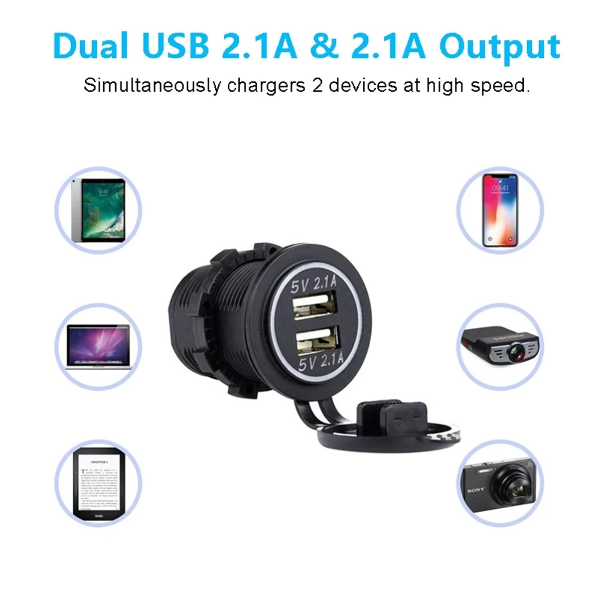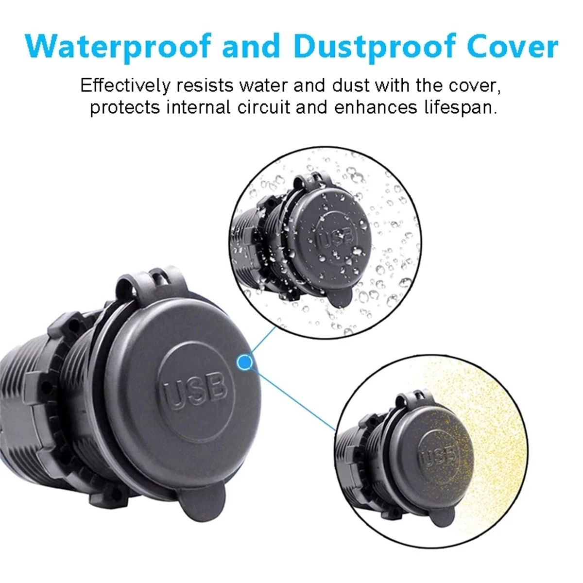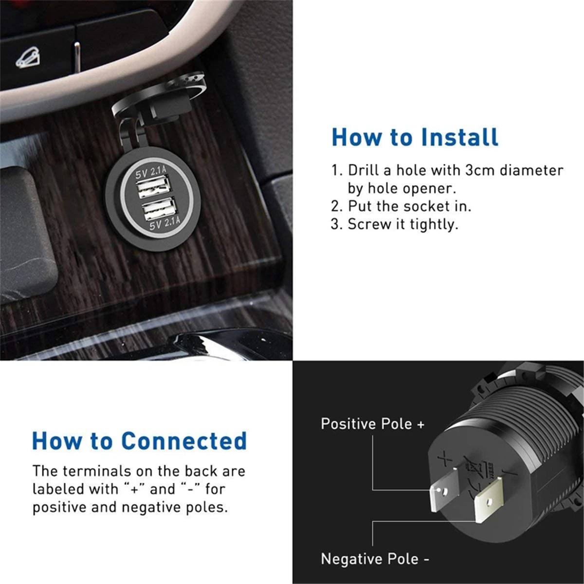 Диаметр отверстия 2,85 см. Подходит для большинства транспортных средств приборной панели и панели перекидного переключателя. "+" ДО положительного полюса, "-" до отрицательного полюса. Плотный Пылезащитный колпак защищает usb-порты, когда они не используются.