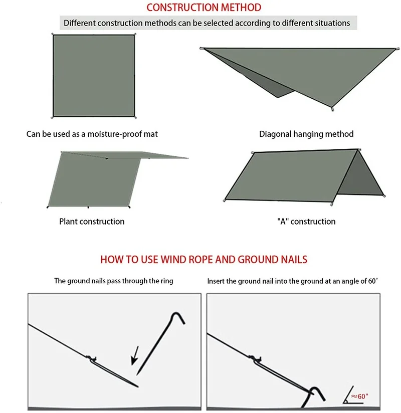 1. Супер водонепроницаемый-интерьер с серебряным покрытием и ПУ 1500 мм водонепроницаемый. Он обеспечивает отличную защиту от дождя, внезапных падений, снега и высоких ветров.(Камуфляж не покрыт серебром)2. Непрерывное затенение-тент покрыт солнцезащитным покрытием внутренний слой, легкий брезент может обеспечить УФ-защиту на солнце. Отлично подходит для кемпинга, альпинизма, пеших прогулок или других приключений.3. Легкий и компактный-очень легкий навес для кемпинга, сложенный в сумке, вы почти не заметили, что носите его. Посылка маленькая и может быть размещена практически в любом небольшом пространстве.4. Простота установки-использование в качестве сверхлегкого брезента от дождя, аварийного укрытия, палатки или навес для кемпинга. Легко покрывает двойной гамак палатки и укрытия.5. Широкий спектр применения-Защита от УФ, водонепроницаемость, один брезент для всех условий и сезонов. Отлично подходит для кемпинга, альпинизма, пеших прогулок или других приключений.