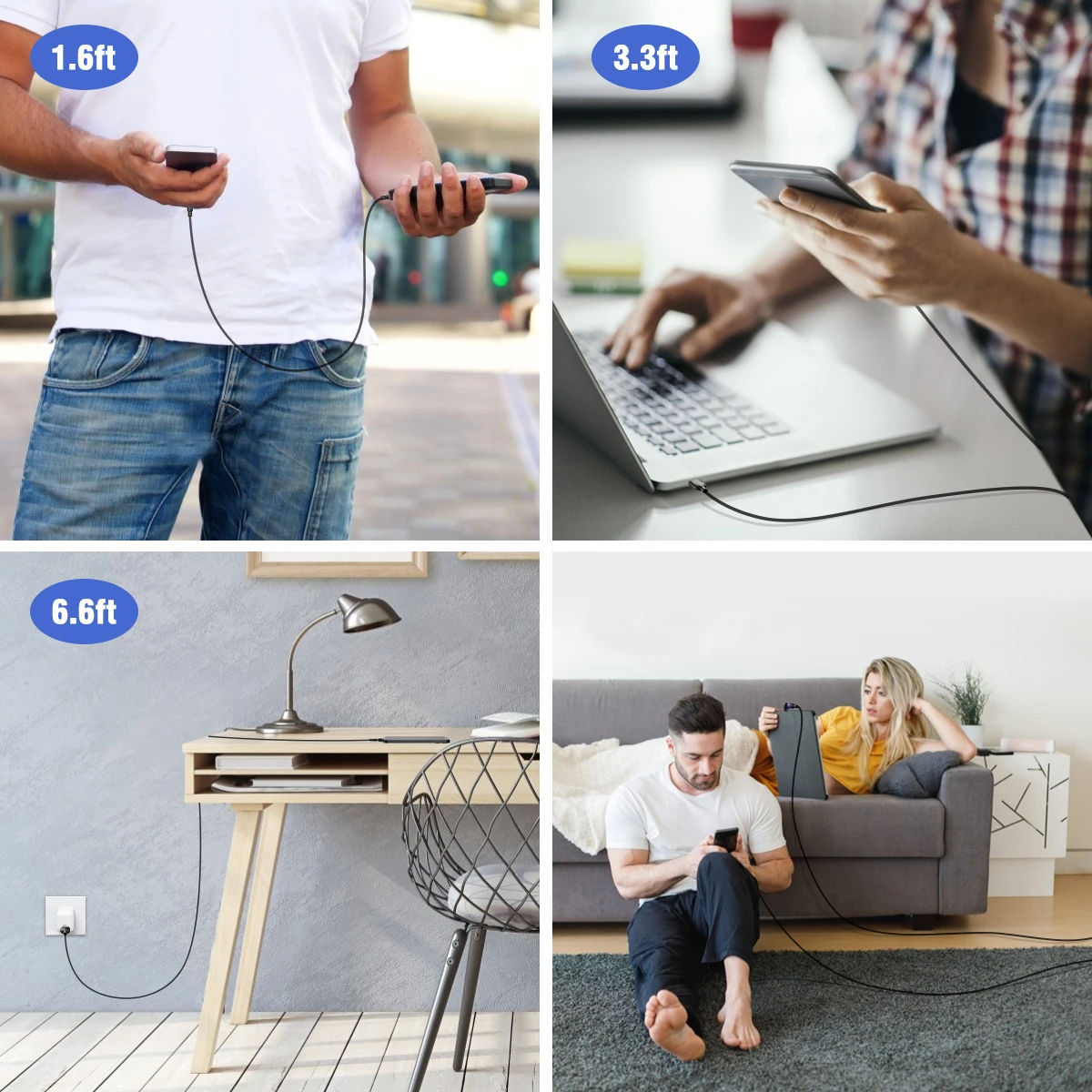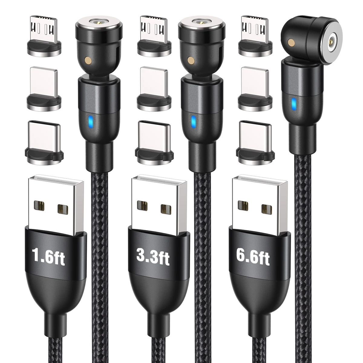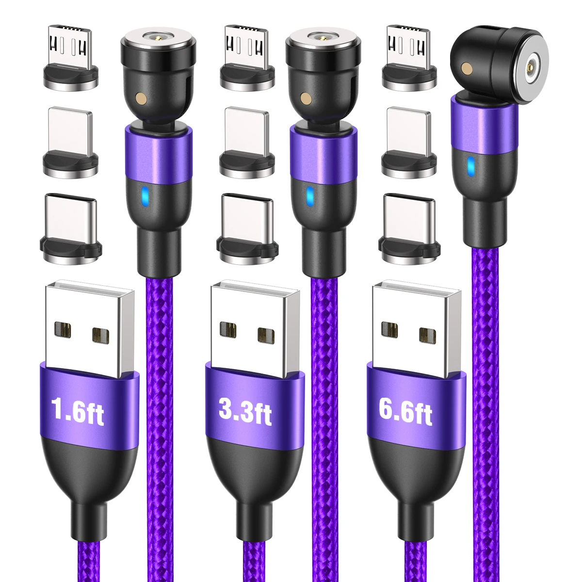 3-Pack Магнитный зарядный кабель с различными комбинациями длины, которые включают в себя:1 x Магнитный кабель 1,6 футов,1x3 фута Магнитный кабель,1 x Магнитный кабель 6,6 футов,3х Магнитный микро-наконечник,3 x Магнитный тип-c наконечник,3 магнитных наконечника для ios.