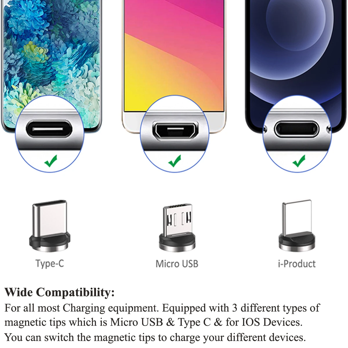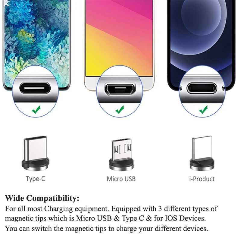 ☺3 в 1 дизайн и широкая применимостьМагнитный зарядный шнур * 3 магнитные микро наконечники * 3, магнитные тип-c наконечники * 3, магнитные i-product наконечники * 3. Для всех большинства зарядных устройств. Вы можете переключить магнитные наконечники для зарядки различных устройств.☺180 ° и 360 ° вращающийся магнитный дизайн180 ° L форма и 360 ° вращающаяся магнитная головка, она имеет все функции прямого и 90 градусов l-образного магнитного кабеля, что более удобно для игр в игры.☺Сильный магнитUSB Магнитный зарядный кабель поставляется с более сильный магнит, который позволит избежать отключения.☺Наивысшее качествоОбеспечить максимальную скорость зарядки до 2,4 А, зарядить быстрее, чем большинство стандартных кабелей и работать лучше для скорости. (Примечание: Магнитный зарядный кабель не предназначен для передачи данных)