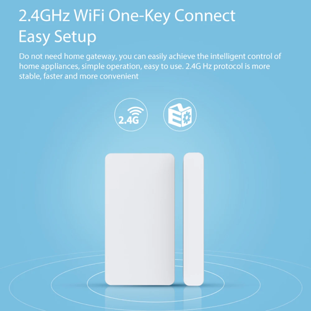 1. Поддержка Wi-Fi 2,4 ГГц, максимальный диапазон беспроводной связи может достигать 35 м.2. Бесплатное приложение для IOS и Android.3. Определяет статус открытия/закрытия дверей/окон и push-уведомления на смартфоны.3. Поделитесь устройством с другими. Поддержка нескольких пользователей для редактирования устройств и принятия push-уведомлений.4. Подключите два датчика к настройкам сцены.6. Сброс:(1) Нажмите и удерживайте кнопку сброса в течение 6 секунд, индикатор быстро мигает, умный режим Wi-Fi.(2) Нажмите и удерживайте кнопку reset в течение 6 секунд, индикатор медленно мигает. Режим AP.