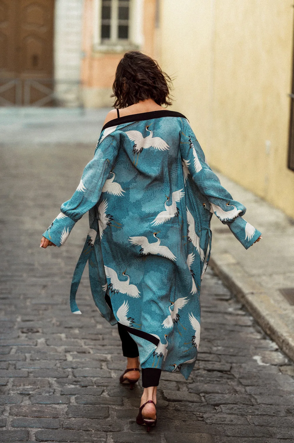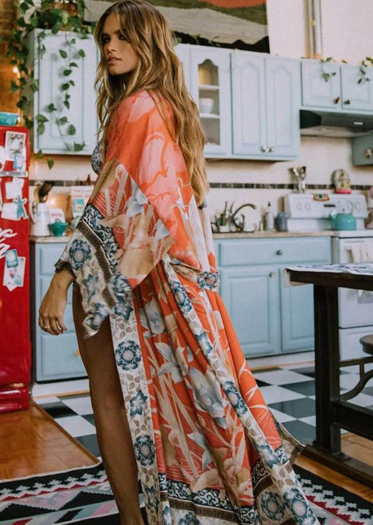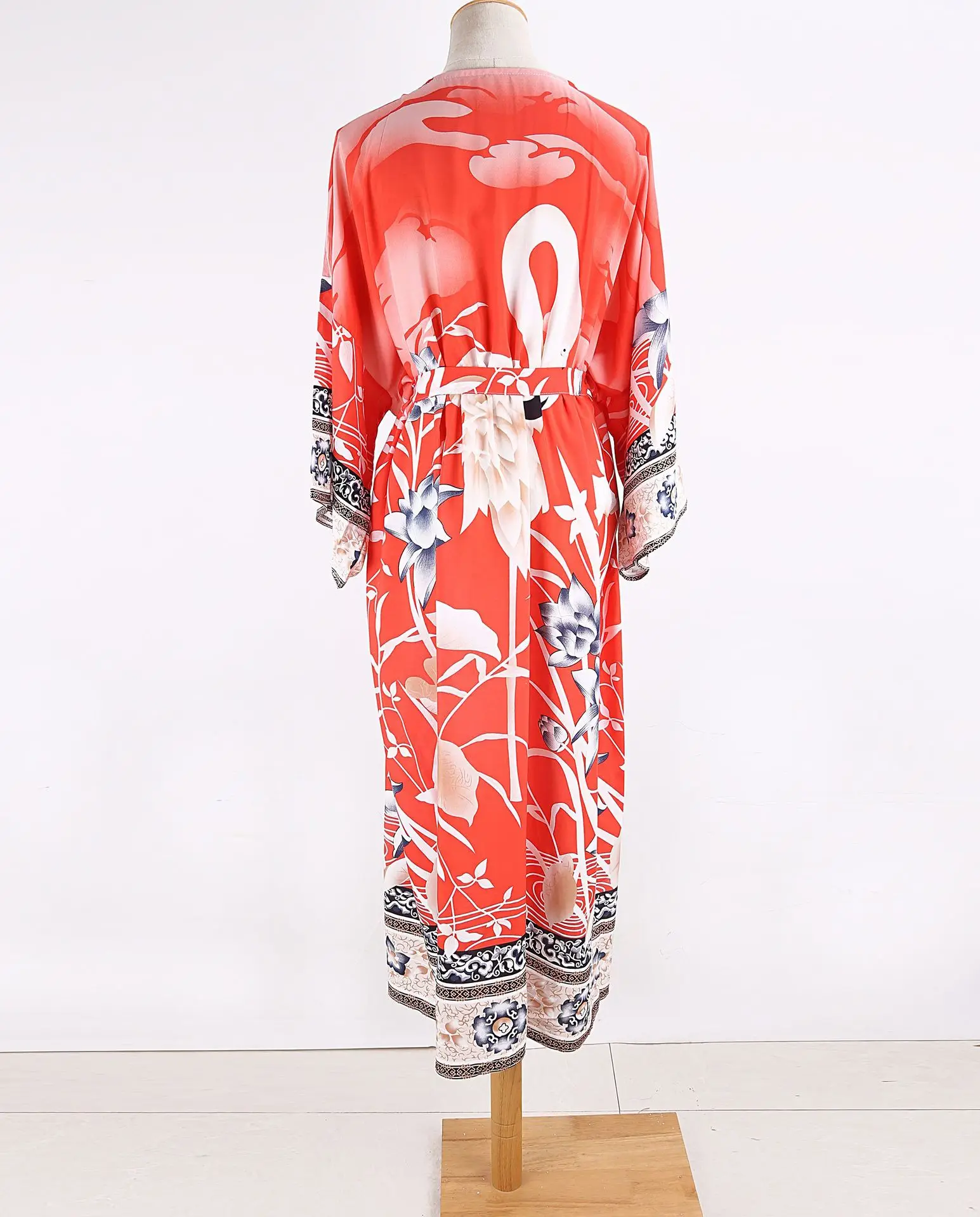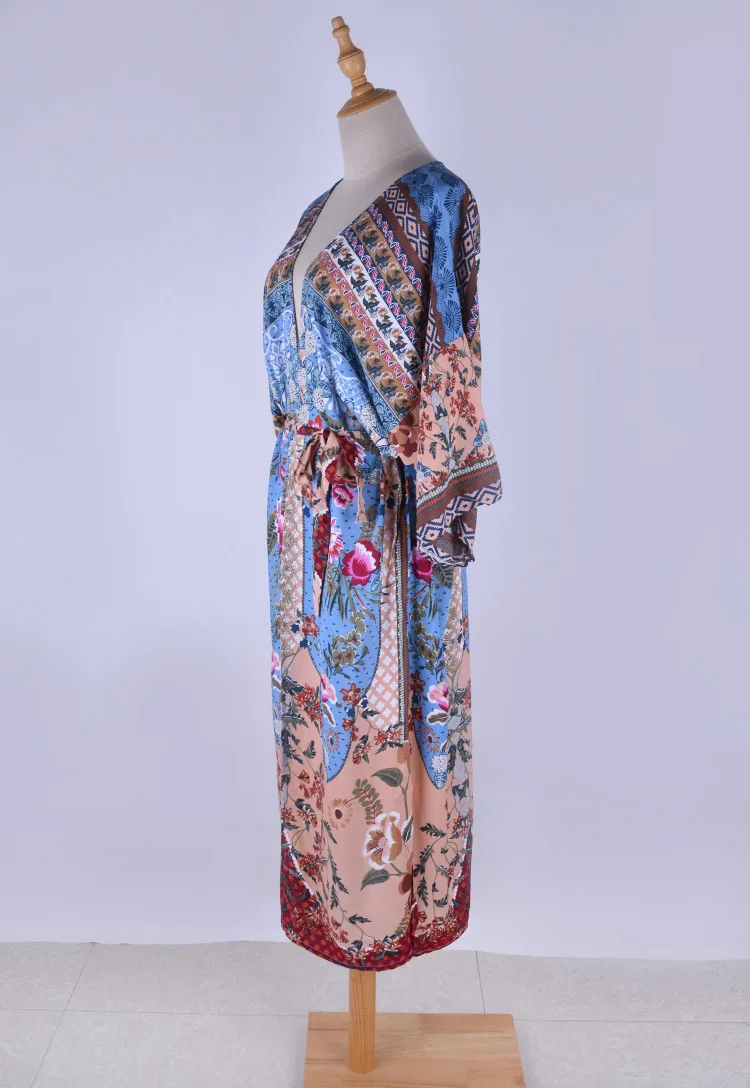 Женское длинное пляжное кимоно с богемным принтом и поясом