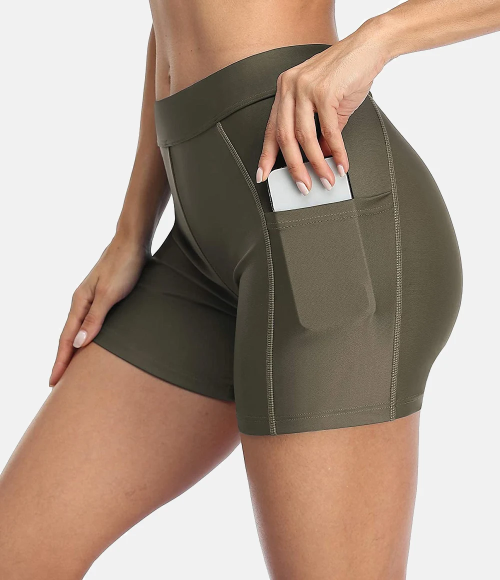 Женские однотонные плавательные шорты с карманами, плавки с высокой посадкой, однотонные пляжные шорты, плавки