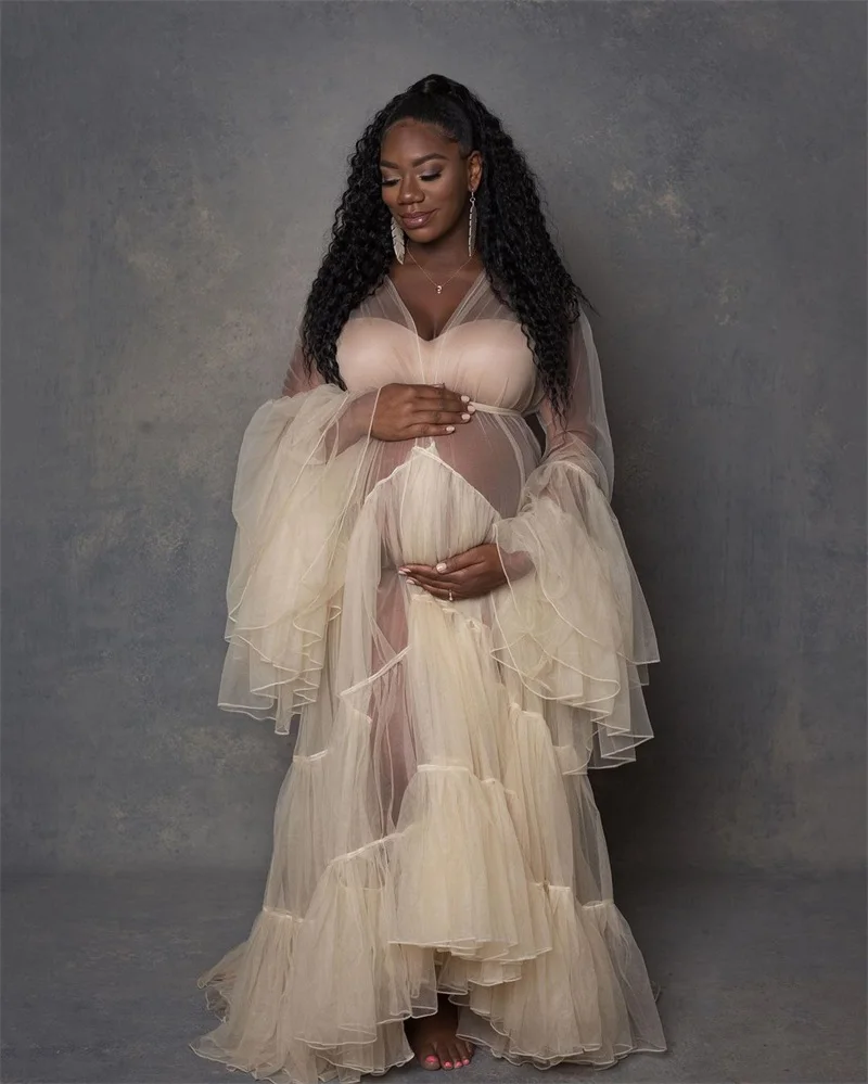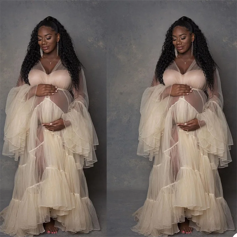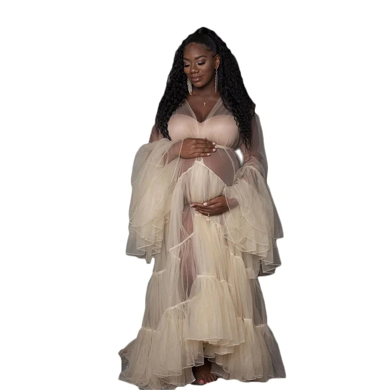 Бежевый ночной халат для беременных женщин, одежда для сна для фотосъемки, сделанный на заказ тюлевый халат с длинными рукавами для беременных