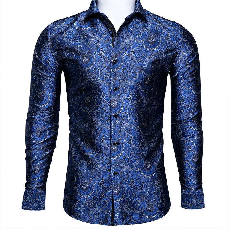 Мужская шелковая рубашка Barry.Wang Fahsion, роскошная синяя рубашка с длинным рукавом, с цветочным принтом, дизайнерская Классическая рубашка, BCY-0032