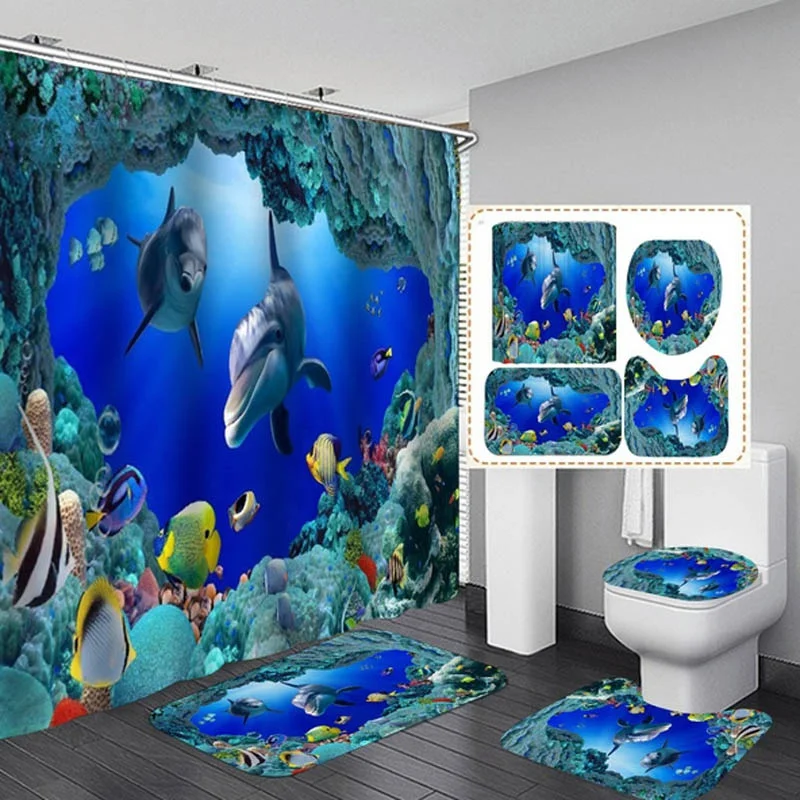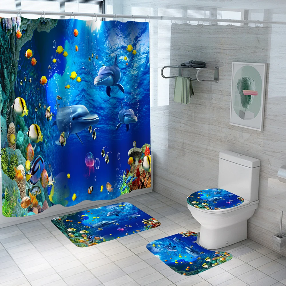 Водонепроницаемая занавеска для душа, Полиэстеровая занавеска для ванной с рисунком океана, дельфина, рыбы, s-образный комплект, нескользящая детская крышка, напольный коврик для ванной