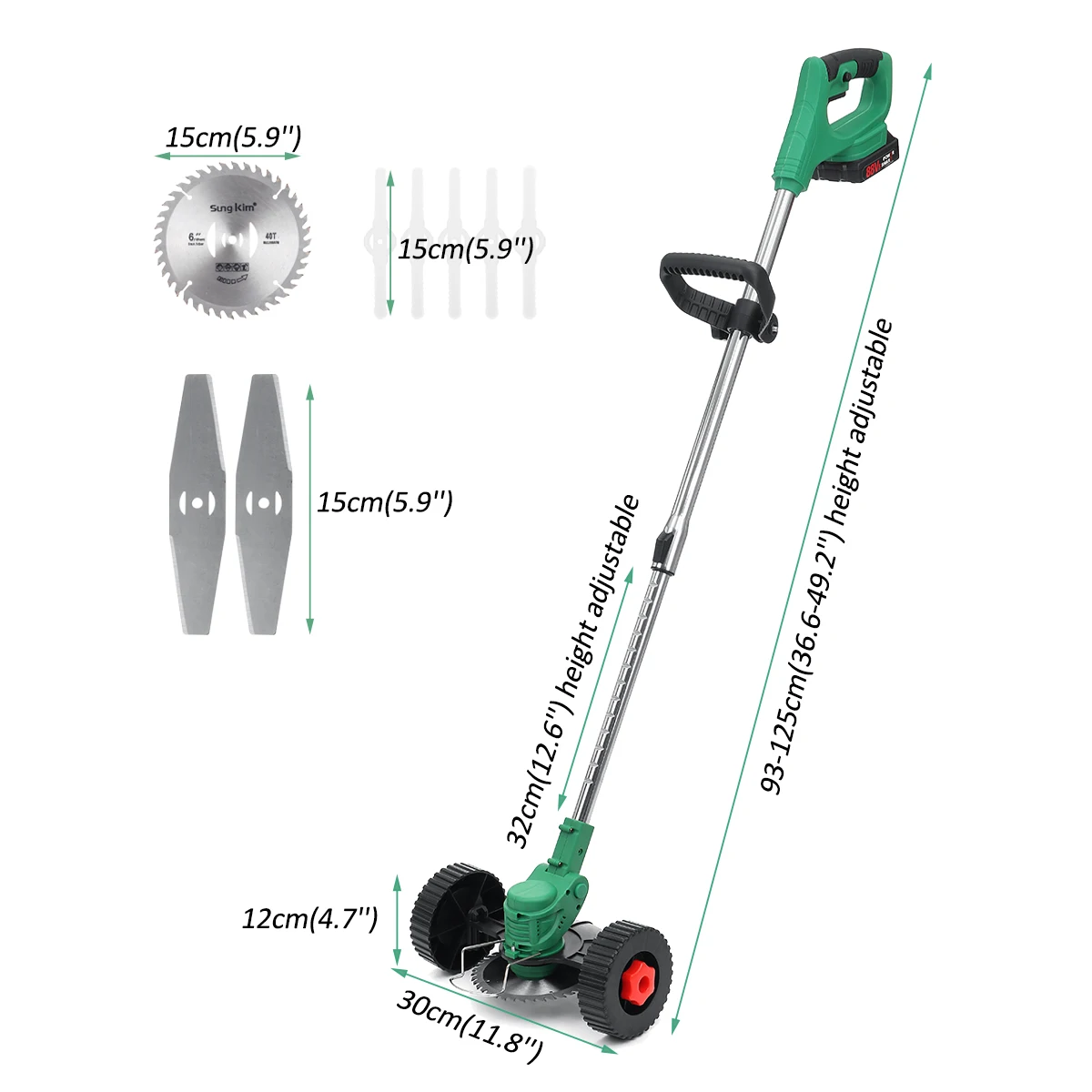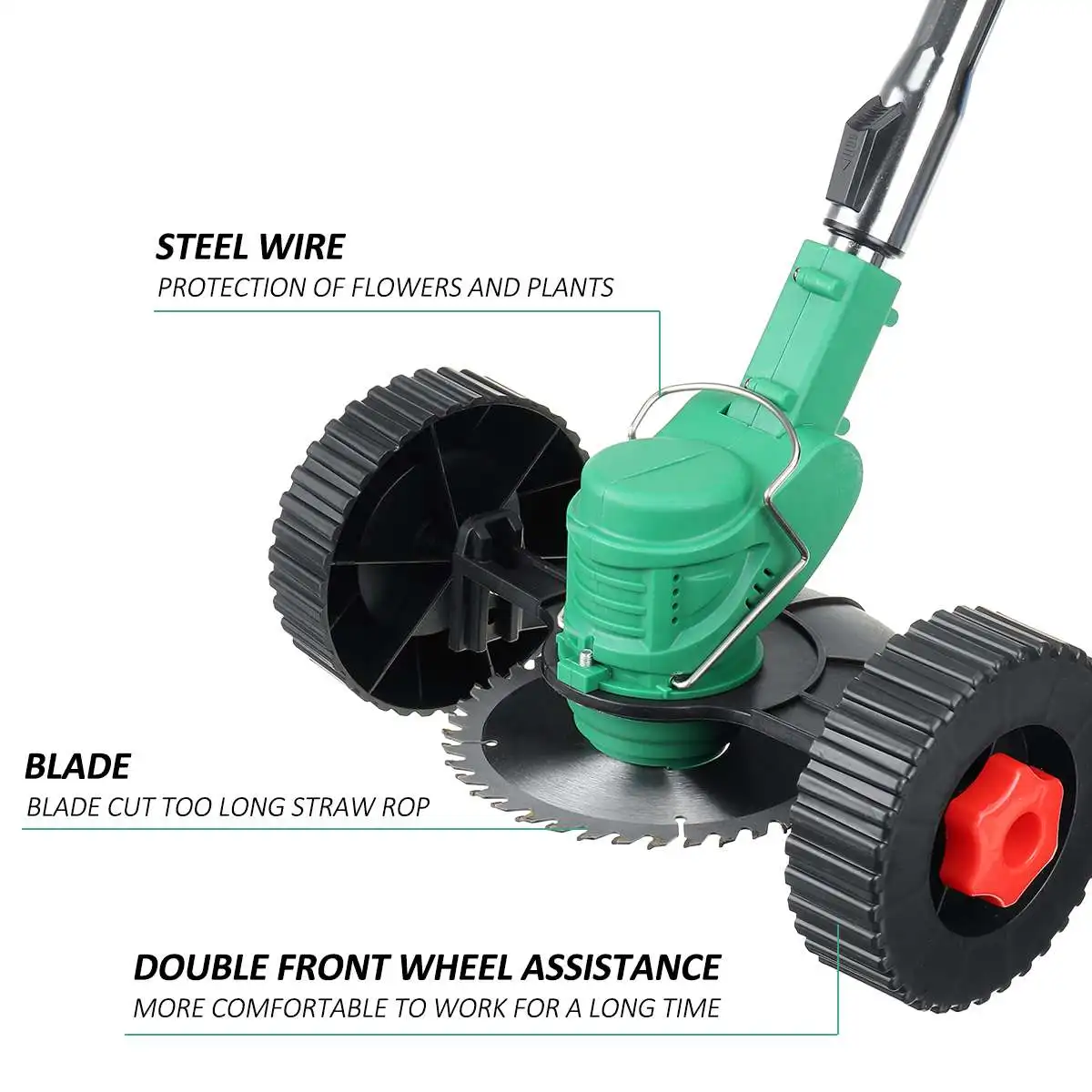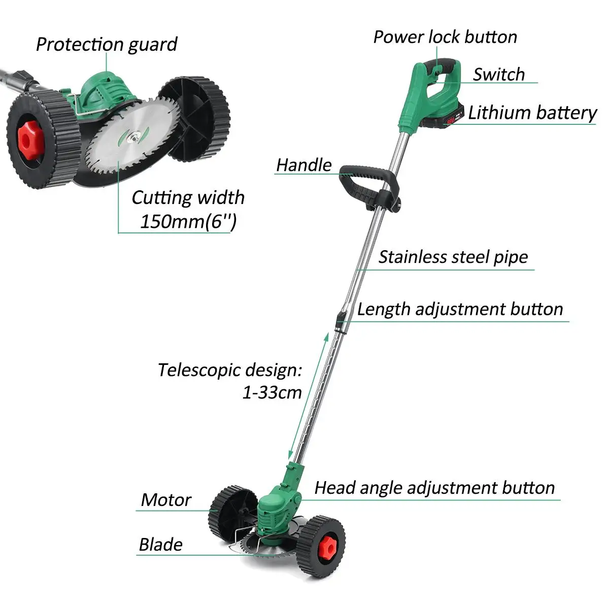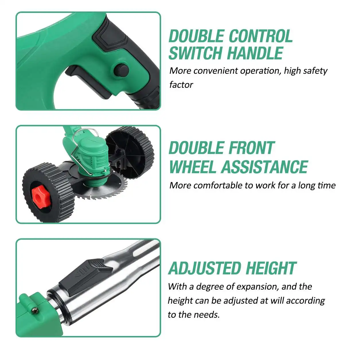 Особенности:-Двигатель из чистой меди, высокая мощность, быстрая скорость.-Провод для предотвращения столкновений, лезвие защитной рамы никогда не прикасается к твердым предметам.-Регулируемая головка машины, без мертвого угла.-Водонепроницаемый Чехол, не легко просачиваться в дождь или розу во время использования.-Диаметр резки, диаметр резки до 150 мм, высокая эффективность.-Удобная вспомогательная ручка, удобная ручка, без ручного трения, положение можно регулировать по желанию.-Двойное переднее колесо, более удобное для работы в течение длительного времени.-Двойная ручка переключателя управления, более удобная работа, высокий коэффициент безопасности.-Секционный полюс может быть отрегулирован по желанию, со степенью расширения, и высоту можно отрегулировать по желанию в соответствии с потребностями.
