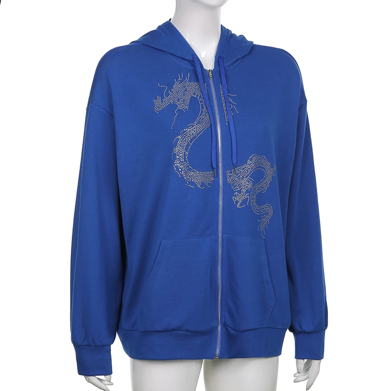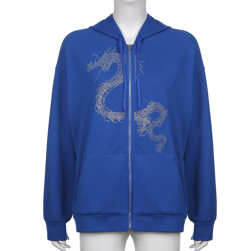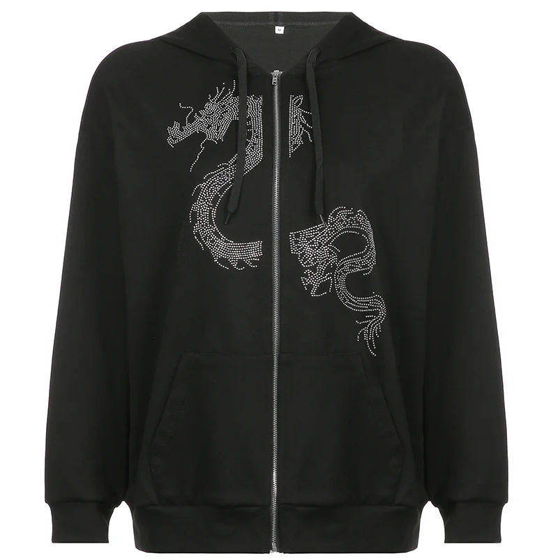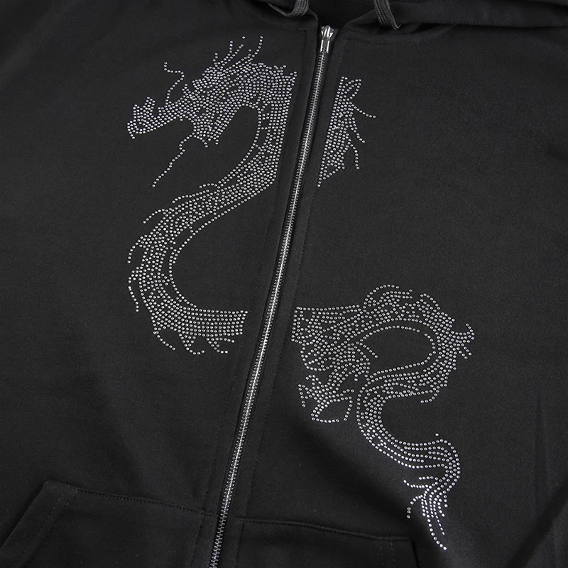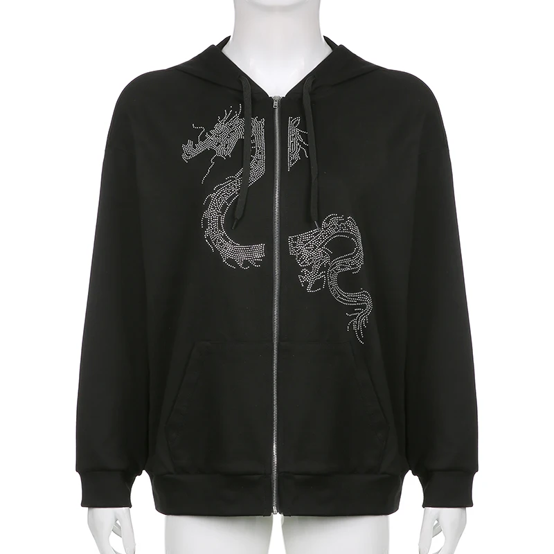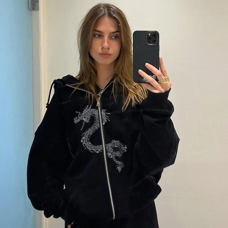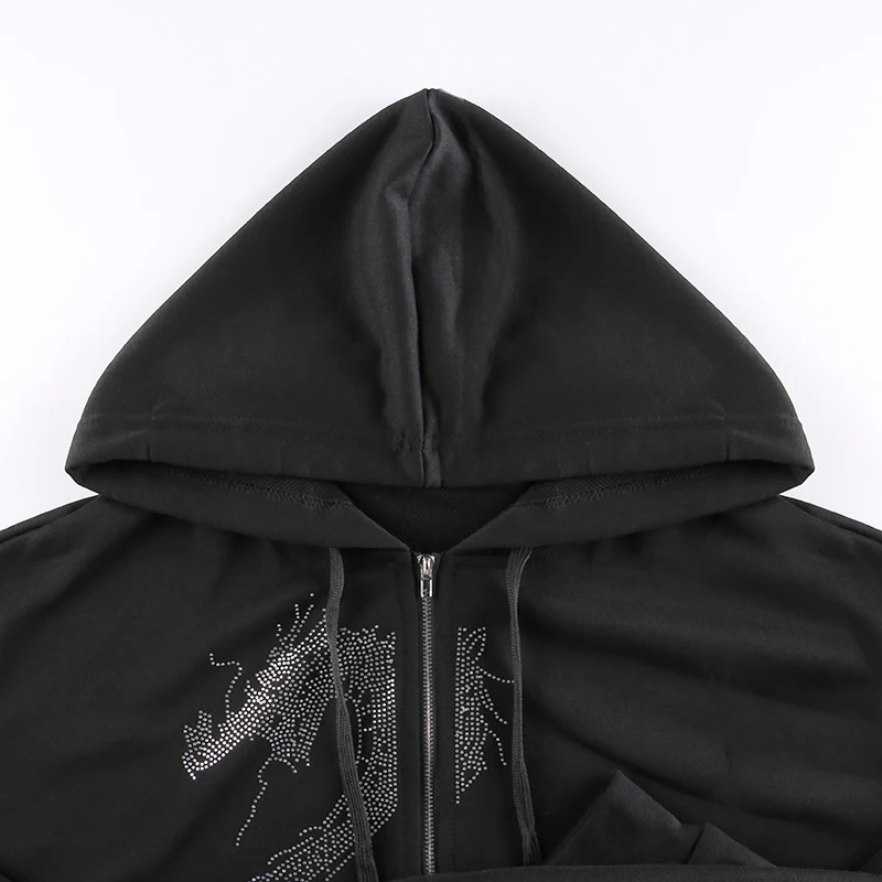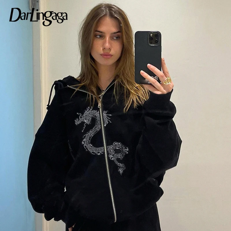 Толстовка Darlingaga женская с капюшоном на молнии, уличная одежда в готическом стиле, Худи оверсайз с драконом и стразами, пальто на осень-зиму
