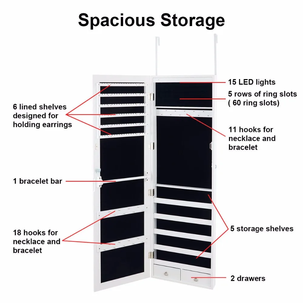 Двери или настенные для экономии большего пространстваЛегко собираетсяИдеально подходит для спальни, ювелирного магазинаПараметрыЦвет: белыйМатериал: натуральное стекло, качественный МДФ, мягкий бархатГабаритные размеры: 14,5 "W× 3,5" D × 56,5 "HРазмер зеркала: 43,5 "Lx 10,5" WКоличество из светодиодный свет: 15Батарея: 3 * AAA (не входит в комплект)Посылка включает в себя:1 × шкаф для ювелирных изделий