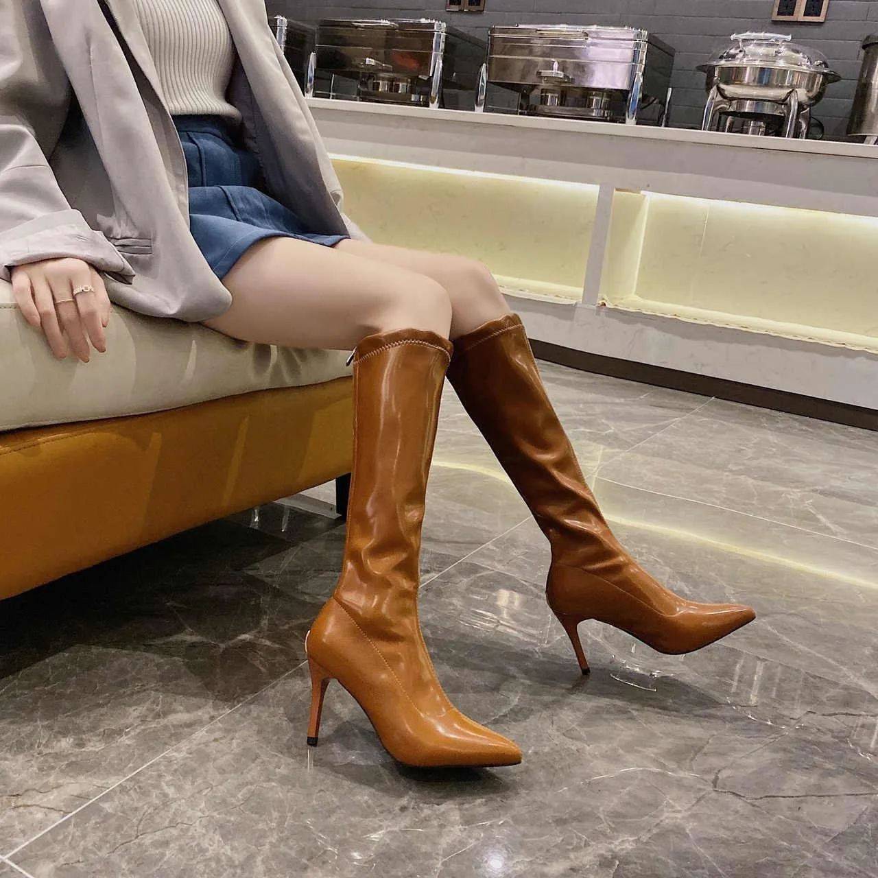 Привлекательные весенние сапоги для танца шеста, женские коричневые сапоги выше колена на высоком каблуке, женские сапоги, женская обувь из лакированной кожи, женские сапоги