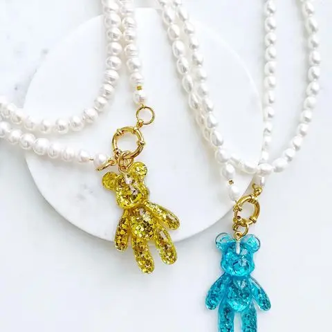 Элегантный милый резиновый клейкий жестокий медведь, подвески, блестящее ожерелье с плоской задней частью из смолы, ожерелье с подвеской из пресноводного жемчуга для женщин