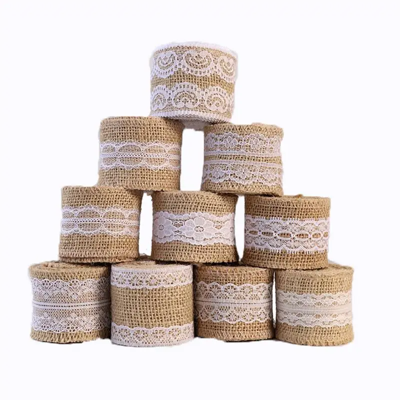 Рулоны джутовой мешковины, ленты из мешковины с белым кружевом, вин...