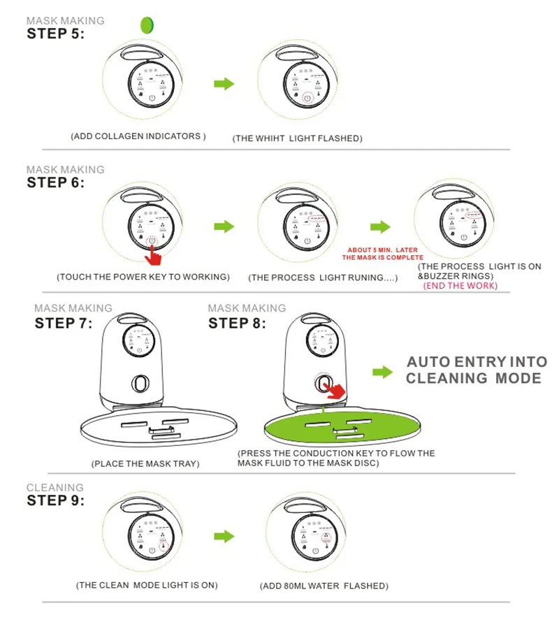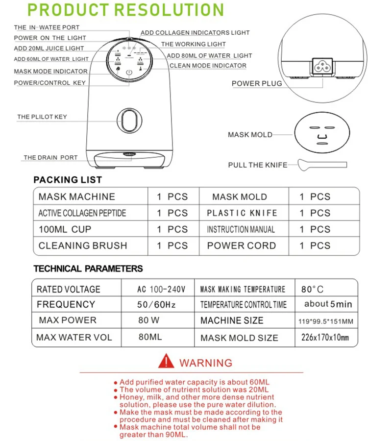 1 * маска машина1 * лоток для маски1 * нож1 * Руководство пользователя1 * Чистящая Щетка1 * Линия электропередачи4 * коллаген1 * мерная чашка