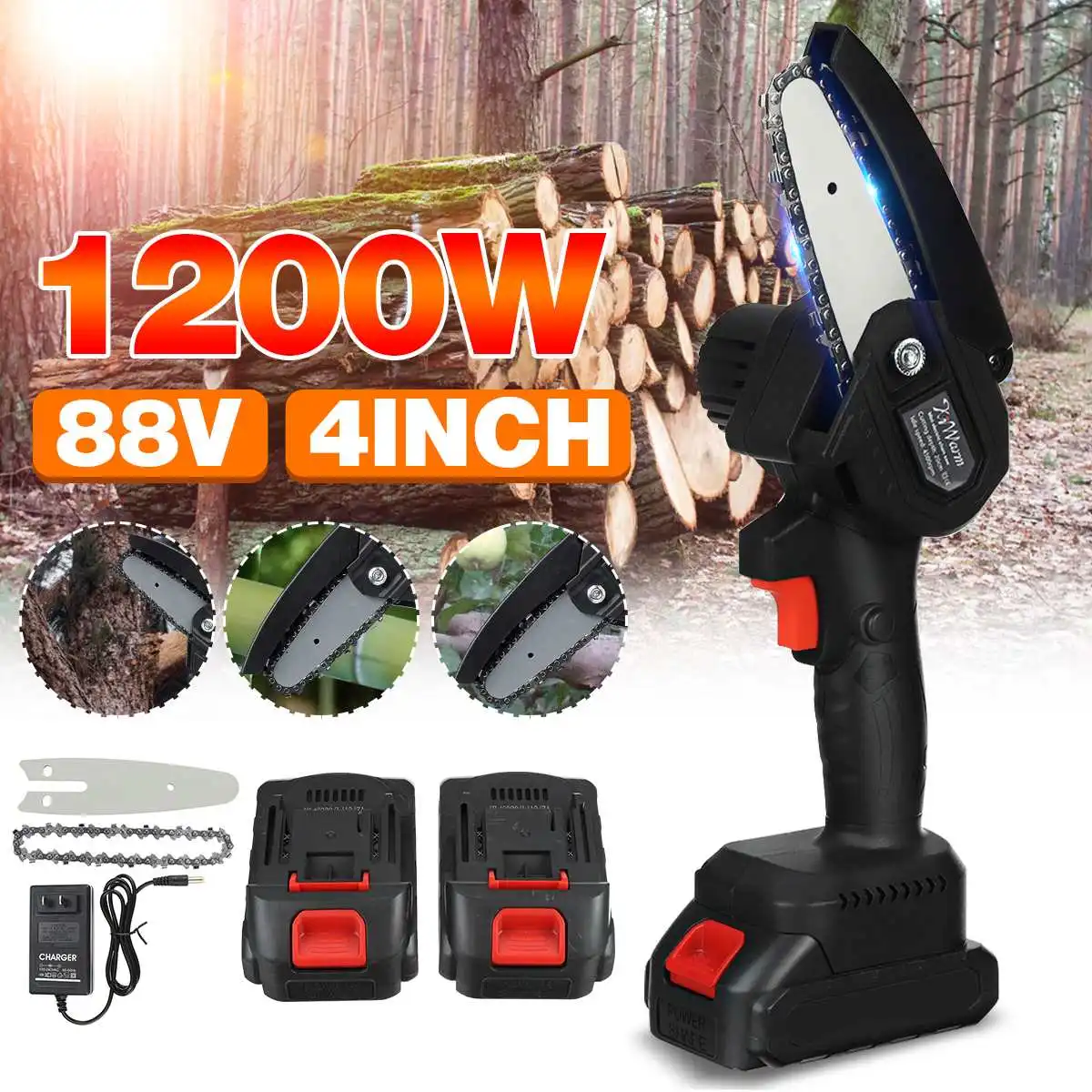 Электрическая цепная мини-пила, 1200 Вт, 4 дюйма, 88 в, с 2 аккумуляторами