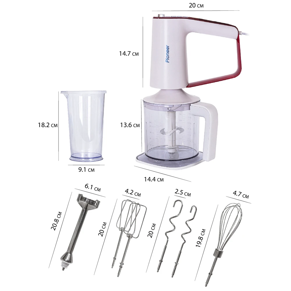 Многофункциональный блендер-миксер 5 в 1 поможет в приготовлении супов, вторых блюд, салатов, соусов, выпечки и десертов, зимних блюд и других блюд. Процесс станет быстрым и приятным. Такой блендер является незаменимой вещью для тех, кто вынуждены придерживаться диетического питания из-за проблем с GCC, для приготовления детского питания и пожилых людей, которые иногда имеют трудное время едыФитинг:Сопло-блендер из нержавеющей сталиBeaters для whipper из нержавеющей сталиКрючки для разминания теста из нержавеющей сталиИзмельчитель с ручкой: 750 млОдиночный КороллаМерное стекло с крышкой: 800 млКлючевые особенности:Максимальная мощность: 500 Вт5 скоростей с плавным переключениемИмпульсный режимОбласти применения:Быстрый тест на замесВзбивать яйца, масло или кремПриготовление воздушного печенья, крема или пюреСмешивание различных продуктов для Приготовления Соусов, супов, майонезаИзмельчение мяса, лука, чеснока, ореховОсобенности и преимущества:Стильный дизайнЧехол Изготовлен из высококачественного АБС-пластика, устойчив к влаге и царапинамСветодиодный дисплейЭргономичная ручкаПеременная скоростьГоловки щетки для удаления кнопокПростота использованияЛегкая чисткаУдобный магазинНадежный, стильный и высококачественный миксер 5 в 1 от Pioneer станет незаменимым помощником на вашей кухне.Упаковочный листУстройство с электродвигателем, насадки для разминания теста (2 шт.), смесители (2 шт.), блендер (1 шт.) мерная чашка с крышкой, емкость измельчителя (крышка, шлифовальная насадка с ножами, емкость), Инструкция, гарантийный талон.