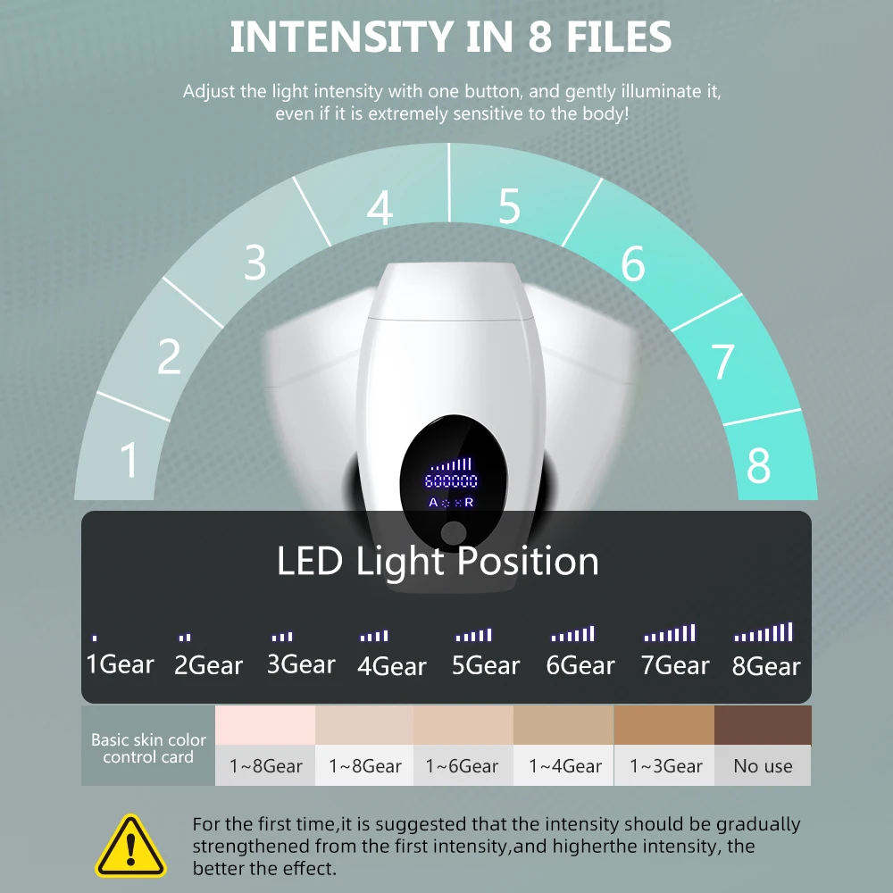 Шаг 1: побрите волосы и высушите кожу. Используйте медицинский спирт для очистки окна вспышки.Шаг 2: Подключите устройство, кнопка питания начнет мигать, что показывает, что находится в режиме ожидания. (Примечание: Кнопка питания-это зеленый светильник вспышки.)Шаг 3: Нажмите кнопку питания в течение 2-5 секунд, машина начинает работу. Выберите уровень энергии. Устройство имеет 5 уровней энергии, от 1 до 5.(Синий светильник интенсивности включен)Шаг 4: Поместите окно вспышки вертикально и надежно на кожу, где вы хотите удалить, нажмите кнопку вспышки