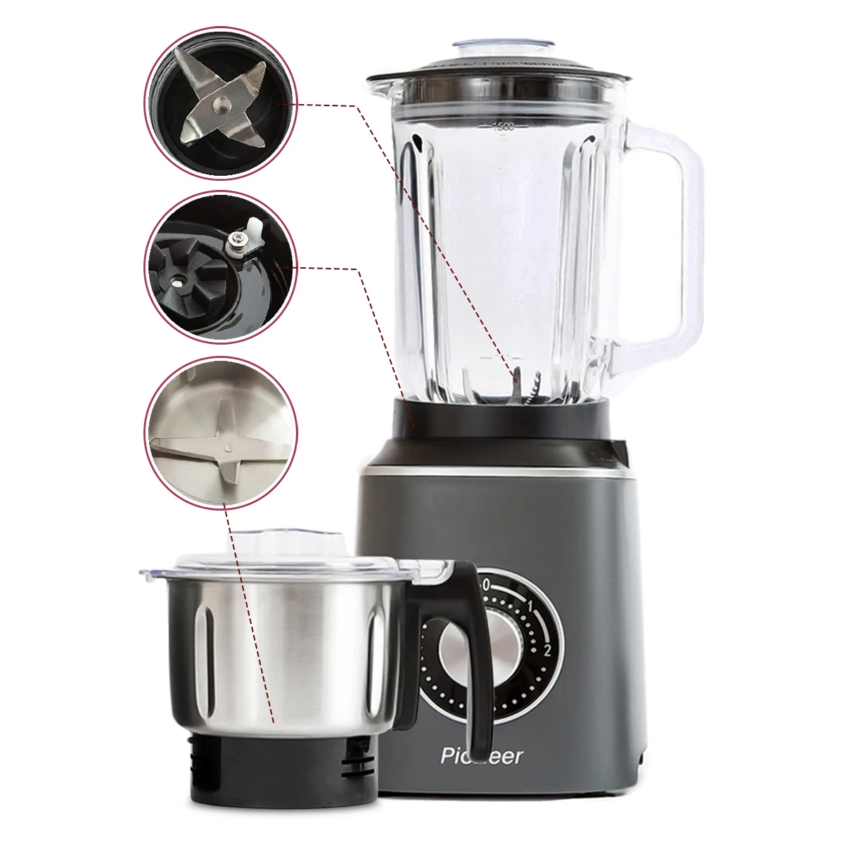 Мы представляем Вашему вниманию новинку бренда Pioneer-надежный, стильный и высококачественный Блендер 2 в 1 стационарном блендере и кофемолке. Это уникальное устройство станет вашим незаменимым помощником и сэкономит место на кухне.С помощью блендера вы будете радовать себя и своих близких различными коктейлями или смузи-полезный, густой напиток из смешанных овощей и фруктов с добавлением молока. Это станет заметным помощником для молодых родителей, потому что в нем вы можете смешивать и измельчать ингредиенты для детского питания. Специально для любителей кофе, мы предоставили мини-измельчитель, который имеет возможность Измельчить не только кофейные зерна, но и другие твердые продукты.Чехол из высококачественного АБС-пластика выполнен в лаконичном дизайне, который отличается простотой и точностью, без лишних деталей в дизайне. Он имеет красивый серый цвет, ручка управления изготовлена из серебристо-белого хрома, который практически не вызывает коррозии, не будет лететь и исчезать с течением времени. Кувшин (1,5 л.) изготовлен из стекла, имеет калибровку с шагом 250 мл. Для предотвращения брызг оснащен съемной пластиковой крышкой с отверстием для последовательного добавления ингредиентов. Для того, чтобы крышка плотно прилегала к баночке и не отлетала во время эксплуатации, наши дизайнеры предоставили силиконовую прокладку.Чашка Кофемолки изготовлена из высококачественной хромированной стали и защищена прозрачной крышкой, благодаря которой вы можете отслеживать степень измельчения зерен и прерывать процесс намотки.Это многофункциональное устройство высокого качества будет отлично смотреться как в классическом, так и в суперсовременном дизайне кухни и поможет подготовить вкусные и полезные напитки и блюда, потому что образ жизни здоровый.Объем стеклянного кувшина составляет 1,5 л, и этого вполне достаточно, чтобы подготовить напиток для семьи или компании. Он может смешивать различные продукты для приготовления смузи, соусов, супов, майонеза, детского питания, напитков и молочных коктейлей. Кроме того, он используется для ледяных хлопьев. Материал ножей изготовлен из прочного материала-нержавеющей стали. Их особенность-дизайн, состоящий из 6 лепестков, такие ножи очень эффективны, так как в отличие от обычных ножей (2-4 лепестка), они намного быстрее. Для удобного использования в крышке стационарного блендера есть отверстие для добавления продуктов, эта конструкция постепенно добавит продукты, что удобно для определенных рецептов. Размер кувшина: высота 23 см, ширина 14 см, глубина 14 см.Объем мини-измельчителя на 500 мл достаточно для измельчения кофе в течение нескольких дней или в компании, потому что свежий молотый кофе-это ароматный и насыщенный вкус. Помимо кофейных зерен в измельчителе, вы можете измельчать и смешивать сухие продукты, такие как орехи, семена, бобовые, злаки и т. д. Чаша измельчителя плотно крепится к корпусу с помощью поворотного устройства. Емкость оснащена 4 прочными ножами из нержавеющей стали и прозрачной крышкой. Размер кофемолки: высота 12 см, ширина 14 см, глубина 14 см.Увеличенная мощность 800 Вт позволит измельчать фрукты, овощи в равномерную массу и измельчать кофе.Блендер оснащен 2 скоростями, это позволяет выбрать оптимальный rpm для определенного типа и количества продуктов:-Средняя скор