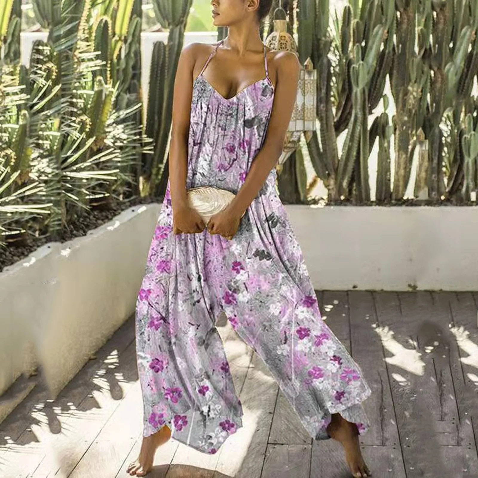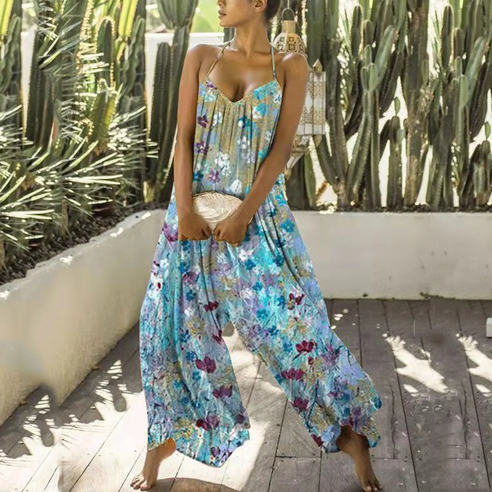 Женский комбинезон в стиле бохо, длинный пляжный комбинезон с цветочным принтом, на пуговицах, Свободный комбинезон с открытой спиной, 35 #